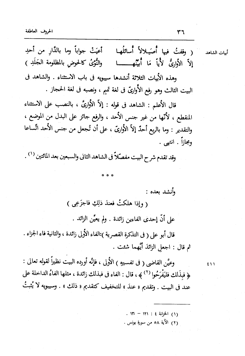 وَهَذِه الأبيات الثَّلَاثَة أنشدها سِيبَوَيْهٍ فِي بَاب الِاسْتِثْنَاء وَالشَّاهِد فِي الْبَيْت الثَّالِث وَهُوَ رفع الأواريّ فِي لُغَة تَمِيم ونصبه فِي لُغَة الْحجاز.