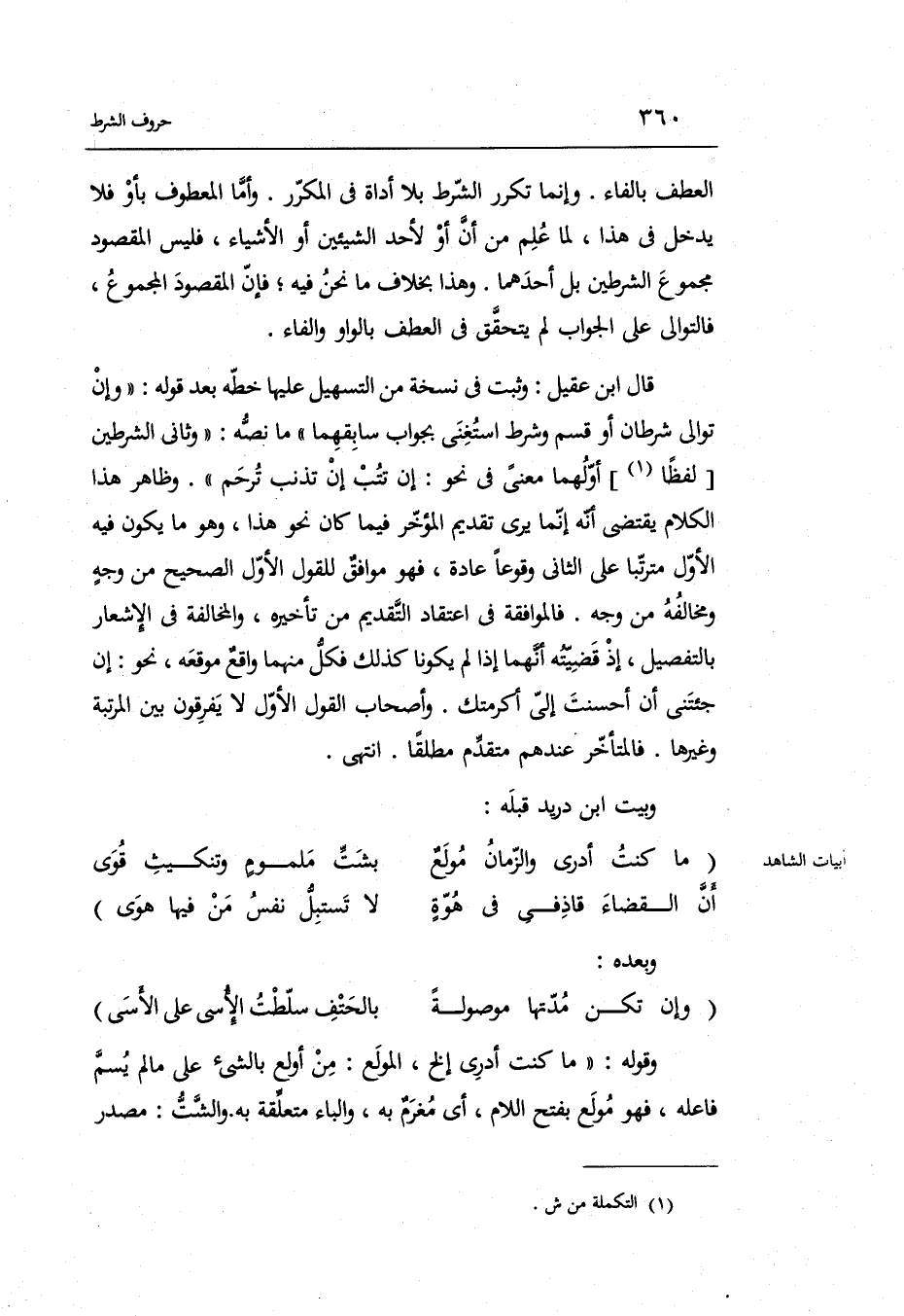 وَالسَّمَاع يشْهد لهَذَا القَوْل قَالَ: إِن تستغيثوا بِنَا الْبَيْت. وَعَلِيهِ عمل فصحاء المولدين وَقَالَ ابْن فَإِن عثرت بعْدهَا إِن وألت الْبَيْت