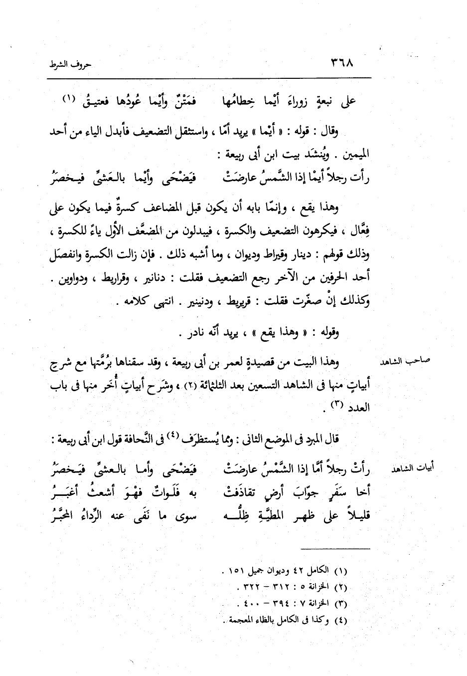 أَقُول: أوردهُ أَبُو الْعَبَّاس الْمبرد فِي الْكَامِل فِي ثَلَاثَة مَوَاضِع فَرَوَاهُ فِي أول الثُّلُث الثَّالِث بالإبدال فِي الْموضع الأول فَقَط وَرَوَاهُ فِي آخر الثُّلُث الأول: أما بِالتَّشْدِيدِ على الأَصْل فِي الْمَوْضِعَيْنِ بِلَا إِبْدَال وَرَوَاهُ فِي أَوَائِله: أَيّمَا بالإبدال فِي الْمَوْضِعَيْنِ فَإِنَّهُ أورد بعض أَبْيَات لجميل بن معمر مِنْهَا فِي وصف قَوس: