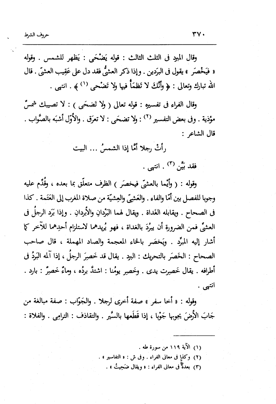 قَالَ ابْن السَّيِّد فِيمَا كتبه على الْكَامِل: عارضت: صَارَت قبالة الْعُيُون فِي الْقبْلَة. قَالَ صَاحب الصِّحَاح: وضحيت بِالْكَسْرِ ضحى: عرقت. وضحيت أَيْضا للشمس ضحاء بِالْمدِّ إِذا برزت. وضحيت بِالْفَتْح مثله. والمستقبل أضحى فِي اللغتين جَمِيعًا. انْتهى.