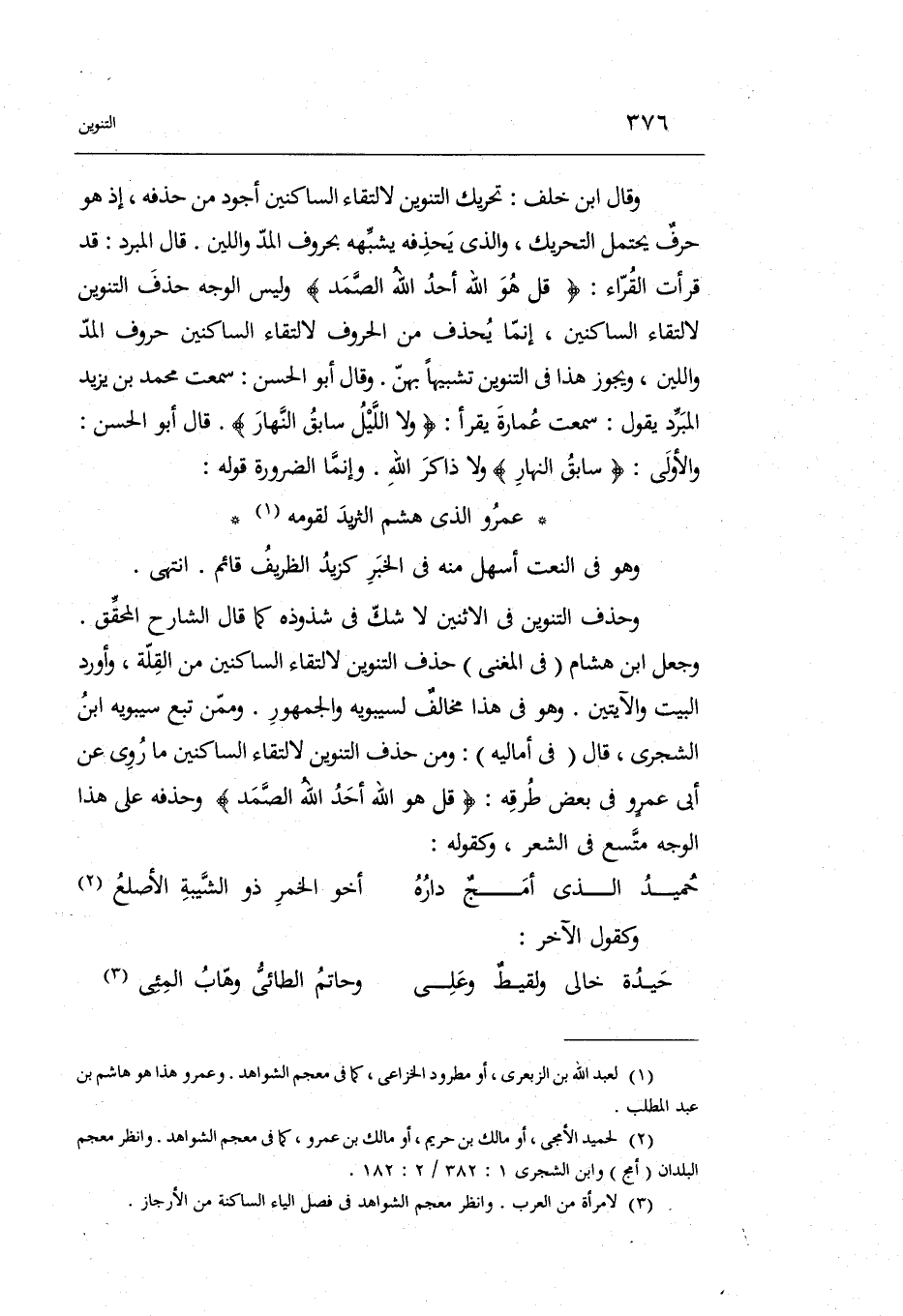 وَإِنَّمَا آثر حذف التَّنْوِين للضَّرُورَة على حذفه للإضافة لإِرَادَة تمثل المتعاطفين فِي التنكير والتنوين يحذف وجوبا للإضافة نَحْو: غلامك ولشببها نَحْو: لَا مَال لزيد إِذا لم تقدر اللَّام مقحمة فَإِن قدرت فَهُوَ مُضَاف ولدخول أل كَالرّجلِ ولمانع الصّرْف نَحْو: فَاطِمَة وللوقف فِي غير النصب وللاتصال بالضمير نَحْو: ضاربك فِيمَن قَالَ إِنَّه غير مُضَاف وللبناء فِي