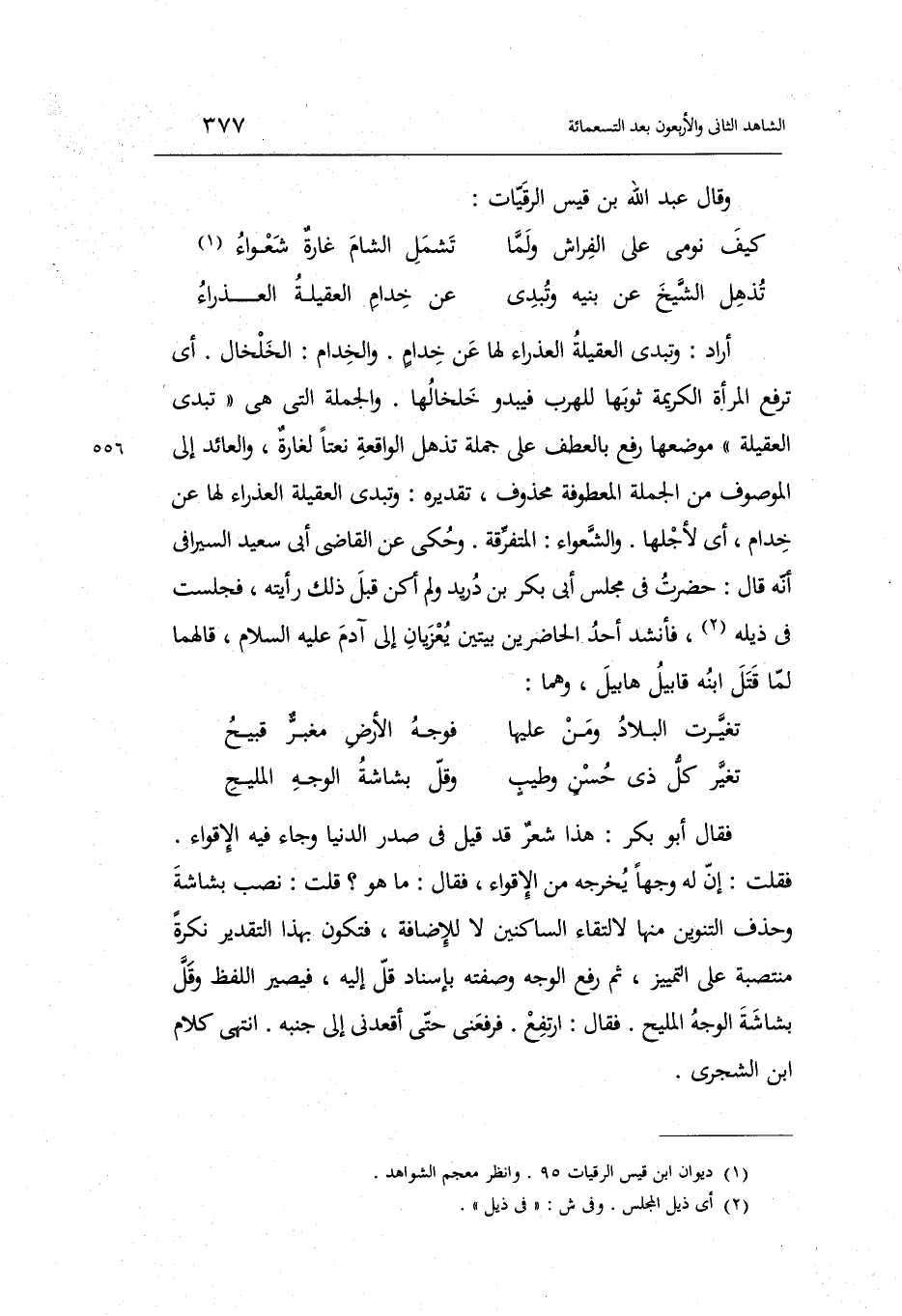 وَحذف التَّنْوِين فِي الِاثْنَيْنِ لَا شكّ فِي شذوذه كَمَا قَالَ الشَّارِح الْمُحَقق. وَجعل ابْن هِشَام فِي الْمُغنِي حذف التَّنْوِين لالتقاء الساكنين من الْقلَّة وَأورد الْبَيْت والآيتين. وَهُوَ فِي هَذَا مُخَالف لسيبويه وَالْجُمْهُور.