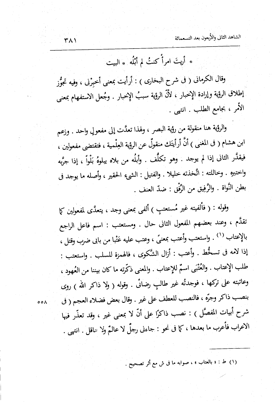 وَقَوله: أريت امْرأ ... إِلَخ سلك أَبُو الْأسود بِهَذَا الْكَلَام طَرِيق التعمية على مُخَاطبَة ليتم مَا يُرِيد وَلَو نسب هَذِه الْعُيُوب إِلَيْهَا مُصَرحًا بهَا لربما دافعوا عَنْهَا. وأريت بِمَعْنى أَخْبرنِي وَأَصله الْهمزَة فِيهِ للاستفهام وريت أَصله رَأَيْت حذف الْهمزَة وَهِي عين الْفِعْل تَخْفِيفًا.