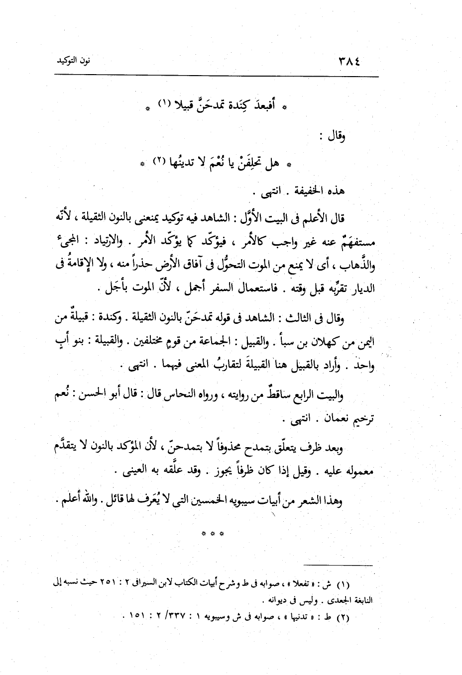 وَهُوَ من شَوَاهِد س: الْكَامِل أفبعد كِنْدَة تمدحت قبيلا على أَنه أكد الْفِعْل وَهُوَ تمدح بالنُّون لوُقُوعه بعد الِاسْتِفْهَام وَهُوَ الْهمزَة.