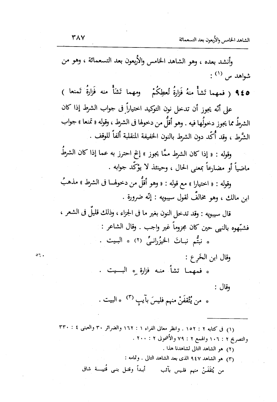 ورد عَلَيْهِ أَن نون الترنم لَا تغير حَرَكَة مَا قبلهَا وَقد غيرت آخِره هُنَا بِالْفَتْح وَهَذَا لَا يكون إِلَّا لنون التوكيد.
