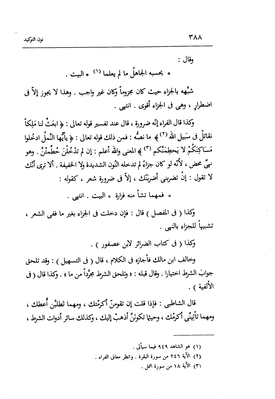 على أَنه يجوز أَن تدخل نون التوكيد اخْتِيَارا فِي جَوَاب الشَّرْط إِذا كَانَ الشَّرْط مِمَّا يجوز دُخُولهَا فِيهِ. وَهُوَ أقل من دُخُولهَا فِي الشَّرْط.