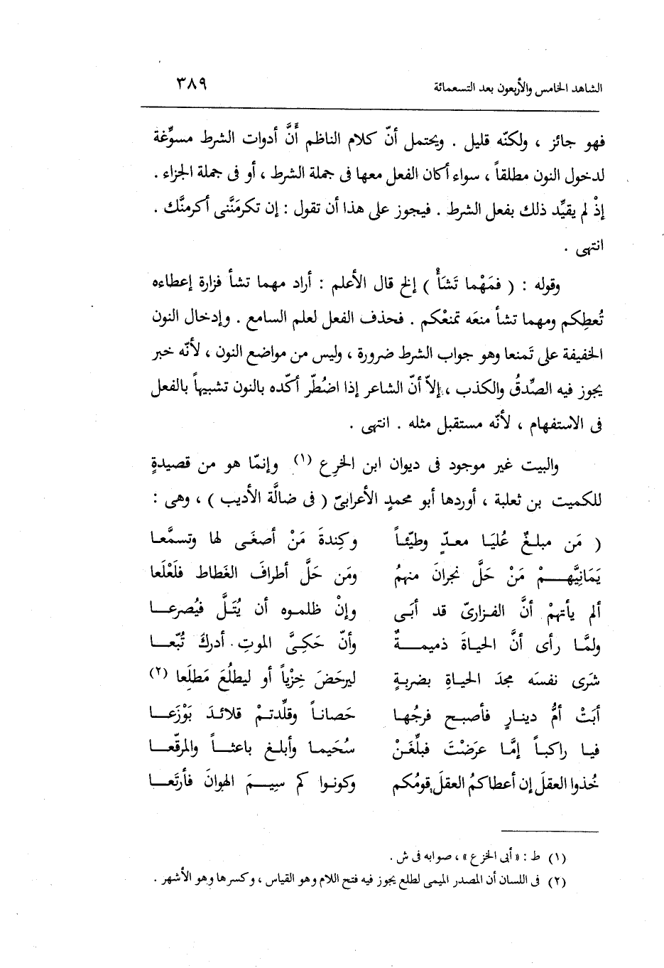 وَقَالَ: يحسبه الْجَاهِل مَا لم يعلمَا الْبَيْت شبهه بالجزاء حَيْثُ كَانَ مَجْزُومًا وَكَانَ غير وَاجِب وَهَذَا لَا يجوز إِلَّا فِي اضطرار وَهِي فِي وَكَذَا قل الْفراء إِنَّه ضَرُورَة قَالَ عِنْد تَفْسِير قَوْله تَعَالَى: ابْعَثْ لنا ملكا نُقَاتِل فِي سَبِيل الله مَا نَصه: فَمن ذَلِك قَوْله تَعَالَى: يَا أَيهَا النَّمْل ادخُلُوا مَسَاكِنكُمْ لَا يحطمنكم.