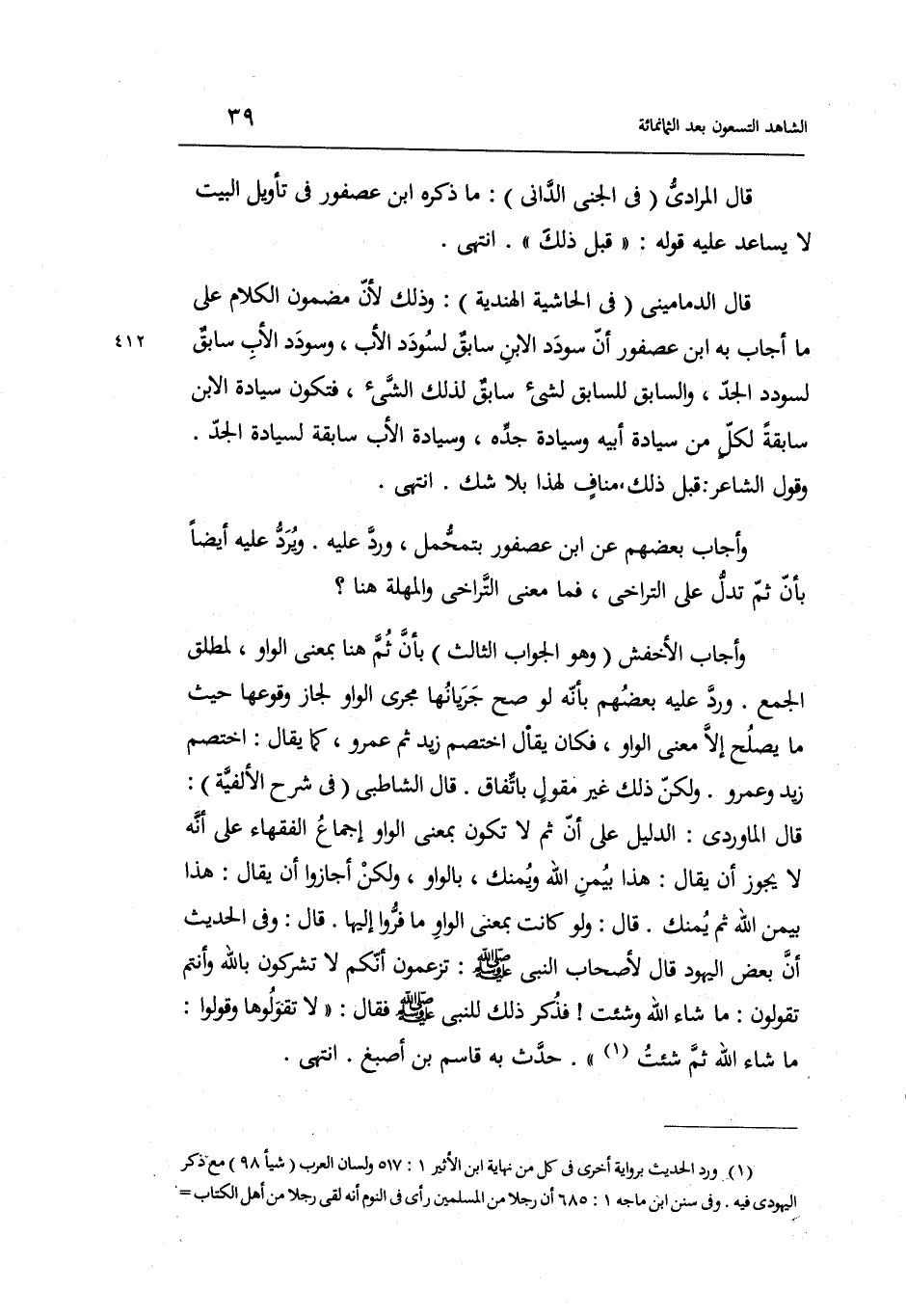 قَالَ الدماميني فِي الْحَاشِيَة الْهِنْدِيَّة: وَذَلِكَ لأنّ مَضْمُون الْكَلَام على مَا أجَاب بِهِ ابْن عُصْفُور أنّ سودد الابْن سَابق لسودد الْأَب وسدود الْأَب سَابق لسودد الجدّ وَالسَّابِق للسابق لشَيْء سَابق لذَلِك الشَّيْء فَتكون سيادة الابْن سَابِقَة لكل من سيادة أَبِيه وسيادة جدّه وسيادة الْأَب وَأجَاب بَعضهم عَن ابْن عُصْفُور بتحمّل وردّ عَلَيْهِ ويردّ عَلَيْهِ أَيْضا بأنّ ثمّ على التَّرَاخِي فَمَا معنى التَّرَاخِي والمهملة هُنَا وَأجَاب الْأَخْفَش وَهُوَ الْجَواب الثَّالِث بأنّ ثمّ هُنَا بِمَعْنى الْوَاو لمُطلق الْجمع. وردّ عَلَيْهِ بَعضهم بِأَنَّهُ لَو صحّ جريانها مجْرى الْوَاو لجَاز وُقُوعهَا حَيْثُ مَا يصلح إلاّ معنى الْوَاو فَكَانَ يُقَال: اخْتصم زيد ثمَّ عَمْرو كُنَّا يُقَال: اخْتصم زيد وَعَمْرو ولكنّ ذَلِك غير مقول بِاتِّفَاق.