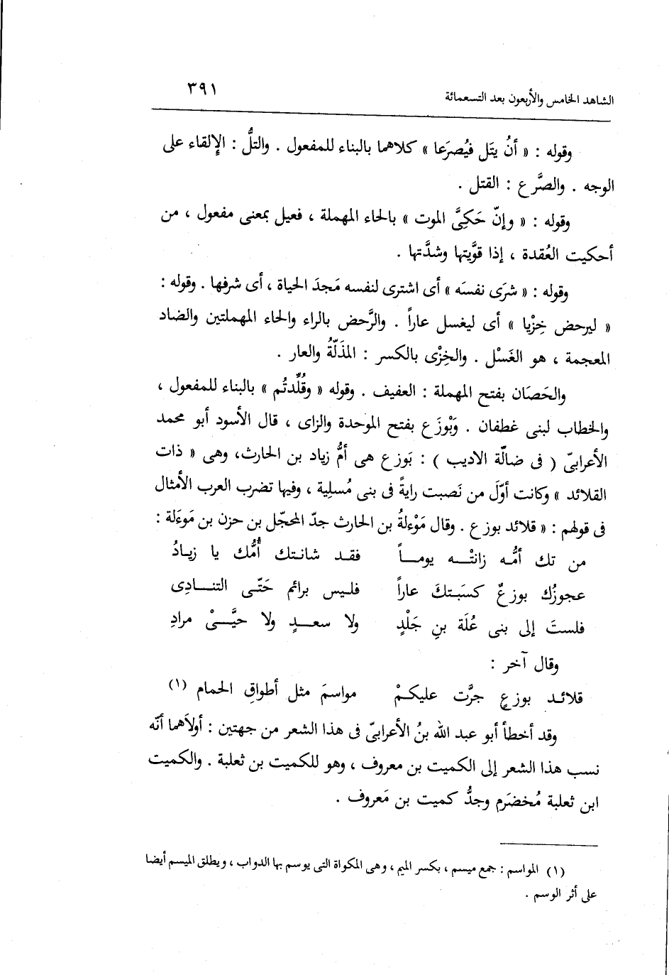 فَحلف زميل أَن لَا ياكل لَحْمًا وَلَا يغسل رَأسه وَلَا يَأْتِي امْرَأَة حَتَّى يقْتله. ثمَّ بعد مُدَّة لقِيه زميل فَضَربهُ بِالسَّيْفِ ضَرْبَة كَانَت سَبَب مَوته وافتخر بتخلصه من الْعَار بقتْله وَقَالَ: الرجز وَتقدم شَرحه فِي الشَّاهِد الْخَامِس بعد الْمِائَة.
