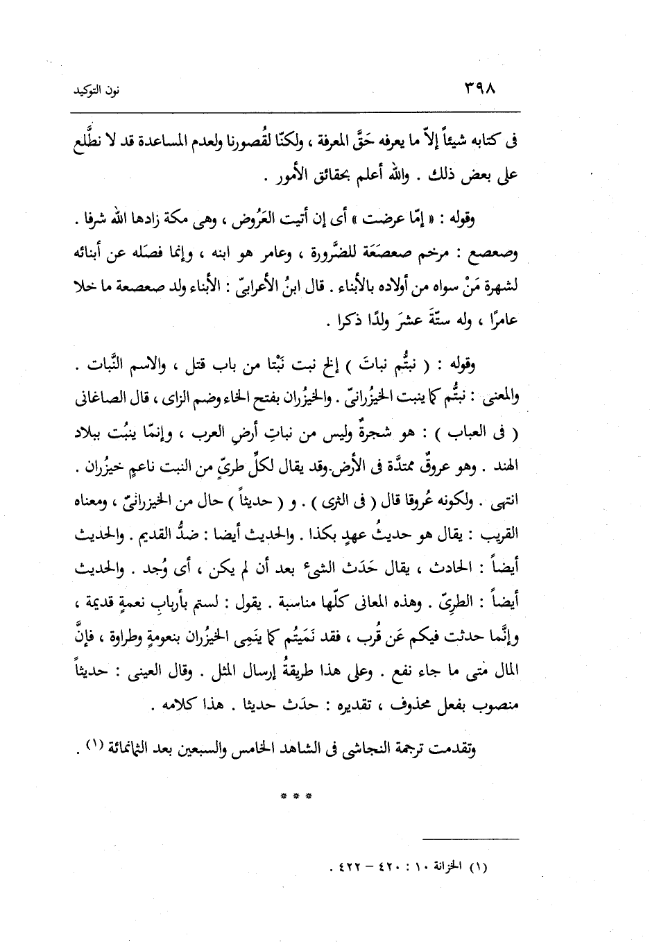 وَقَوله نبتم نَبَات ... الخ نبت نبتاً من بَاب قتل والإسم النَّبَات. وَالْمعْنَى: نبتم كَمَا ينْبت الخيزراني. والخيزران بِفَتْح الْخَاء وَضم الزَّاي قَالَ الصَّاغَانِي فِي الْعباب: هُوَ شَجَرَة وَلَيْسَ من نَبَات أَرض الْعَرَب وَإِنَّمَا ينْبت بِبِلَاد الْهِنْد. وَهُوَ عروق ممتدة فِي الأَرْض. وَقد يُقَال لكل طريٍ ولكونه عروقاً قَالَ فِي الثرى. وحديثاً: حَال من الخيزراني. وَمَعْنَاهُ: الْقَرِيب يُقَال: هُوَ حَدِيث عهدٍ بِكَذَا. والْحَدِيث أَيْضا: ضد الْقَدِيم. والْحَدِيث أَيْضا: الْحَادِث يُقَال: حدث الشَّيْء بعد أَن)