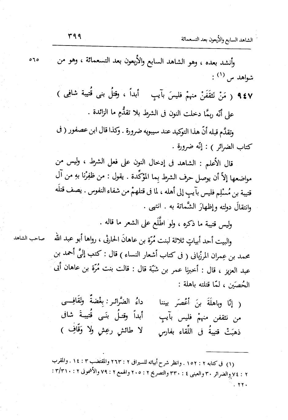 وَتقدم قبله أَن هَذَا التوكيد عِنْد سِيبَوَيْهٍ ضَرُورَة. وَكَذَا قَالَ ابْن عُصْفُور فِي كتاب الضرائر: إِنَّه قَالَ الأعلم: الشَّاهِد فِي إِدْخَال النُّون على فعل الشَّرْط وَلَيْسَ من موَاضعهَا إِلَّا أَن يُوصل حرف الشَّرْط بِمَا الْمُؤَكّدَة. يَقُول: من ظفرنا بِهِ من آل قُتَيْبَة بن مُسلم فَلَيْسَ بآيب إِلَى أَهله لما فِي قَتلهمْ من شِفَاء النُّفُوس. يصف قَتله وانتقال دولته وَإِظْهَار الشماتة بِهِ. انْتهى.