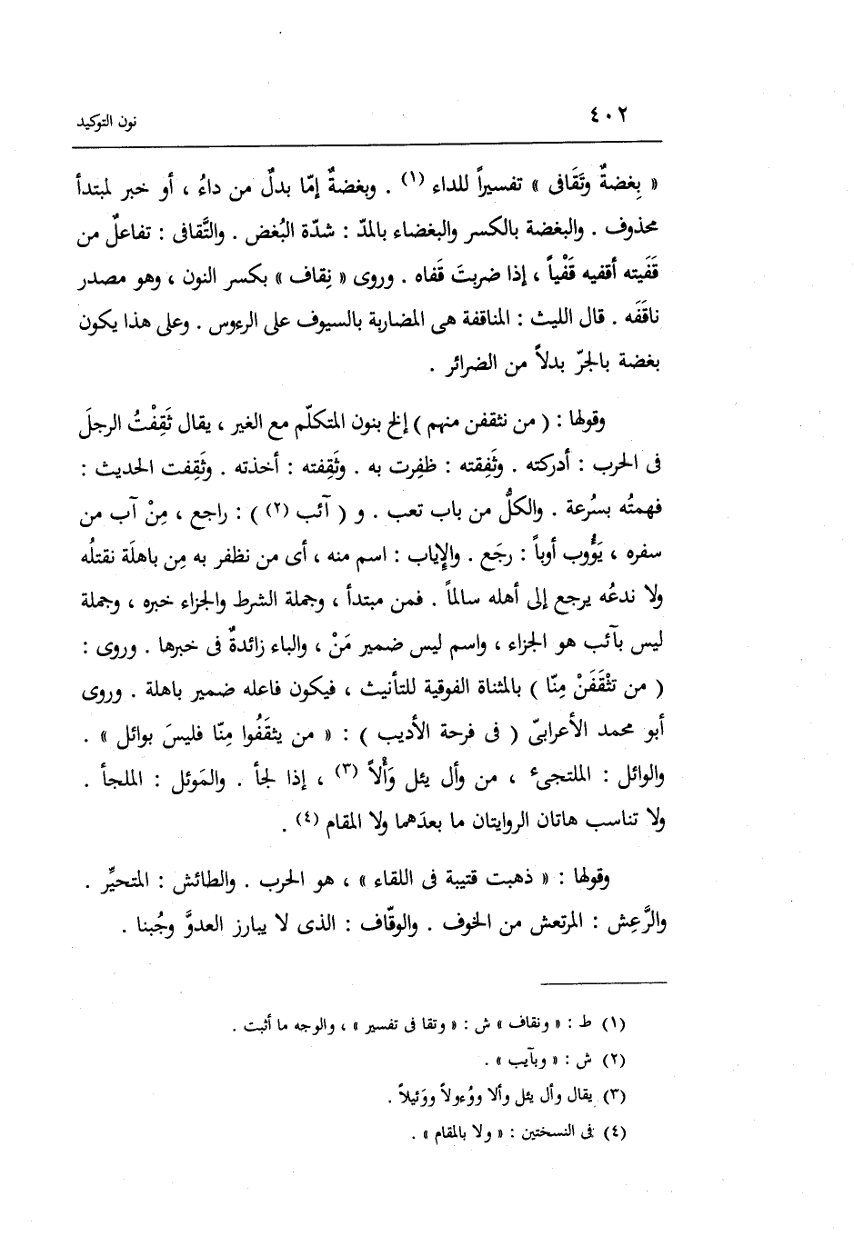 والبغضة بِالْكَسْرِ والبغضاء بِالْمدِّ: شدَّة البغض. والتقافي: تفَاعل من قفيته أقفيه قفياً إِذا وَرُوِيَ: نقاف بِكَسْر النُّون وَهُوَ مصدر ناقفه. قَالَ اللَّيْث: المناقفة: هِيَ الْمُضَاربَة بِالسُّيُوفِ على الرؤوس. وعَلى هَذَا يكون بغضة بِالْجَرِّ بَدَلا من الضرائر.