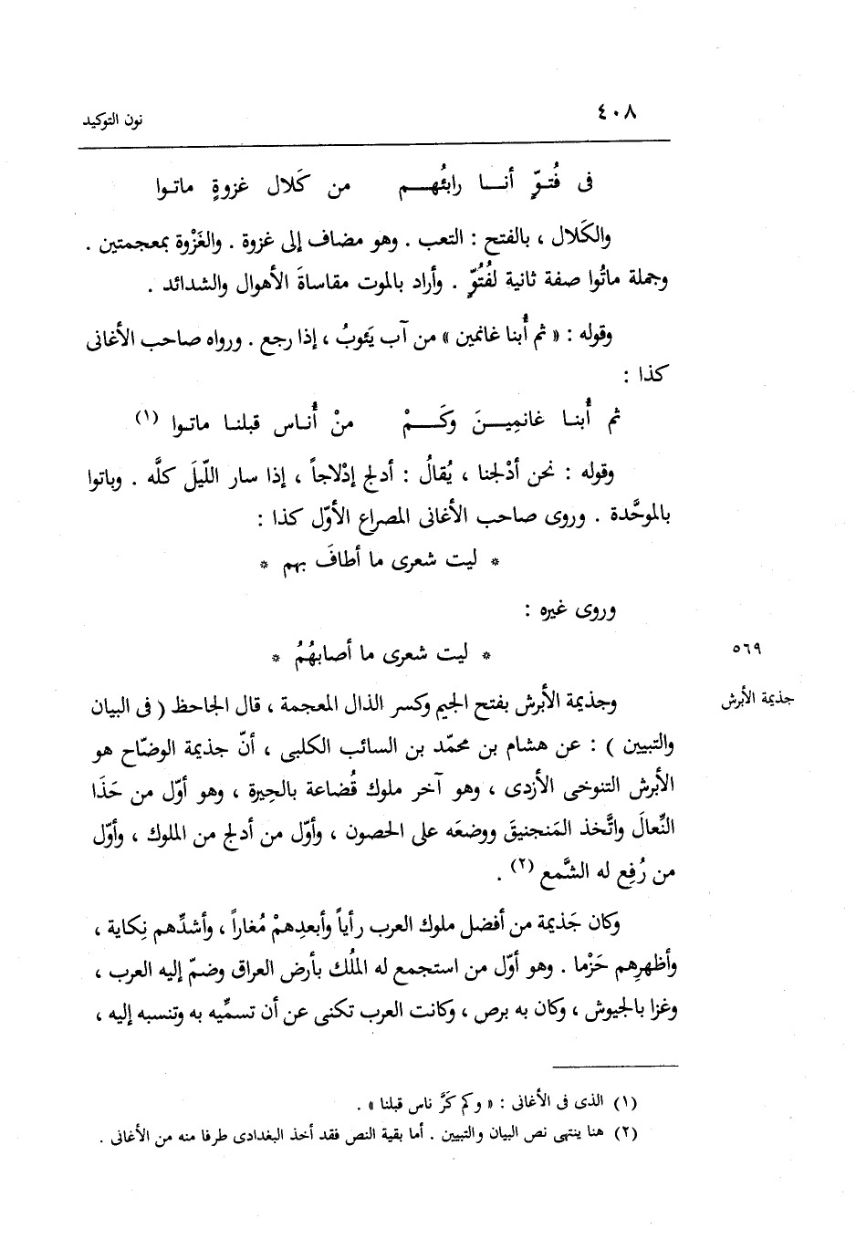 لَيْت شعري مَا أطاف بهم وروى غَيره: وجذيمة الأبرش بِفَتْح الْجِيم وَكسر الذَّال الْمُعْجَمَة قَالَ الجاحظ فِي الْبَيَان والتبيين: عَن هِشَام بن مُحَمَّد بن السَّائِب الْكَلْبِيّ أَن جذيمة الوضاح هُوَ الأبرش التنوخي الْأَزْدِيّ وَهُوَ آخر مُلُوك قضاعة بِالْحيرَةِ وَهُوَ أول من حذا النِّعَال وَاتخذ المنجنيق وَضعه على الْحُصُون وَأول من أدْلج من الْمُلُوك وَأول من رفع لَهُ الشمع.