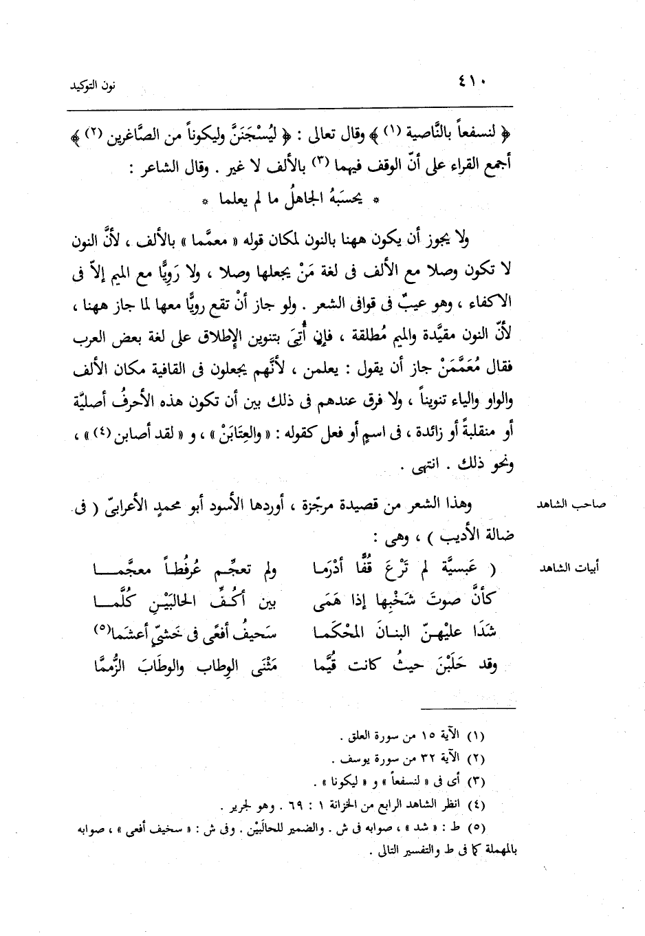 وَقَالَ الشَّاعِر: يحسبه الْجَاهِل مَا لم يعلمَا وَلَا يجوز أَن يكون هَا هُنَا بالنُّون لمَكَان قَوْله: معمما بِالْألف لِأَن النُّون لَا تكون وصلا مَعَ الْألف فِي لُغَة من يَجْعَلهَا وصلا وَلَا روياً مَعَ الْمِيم إِلَّا فِي الإكفاء