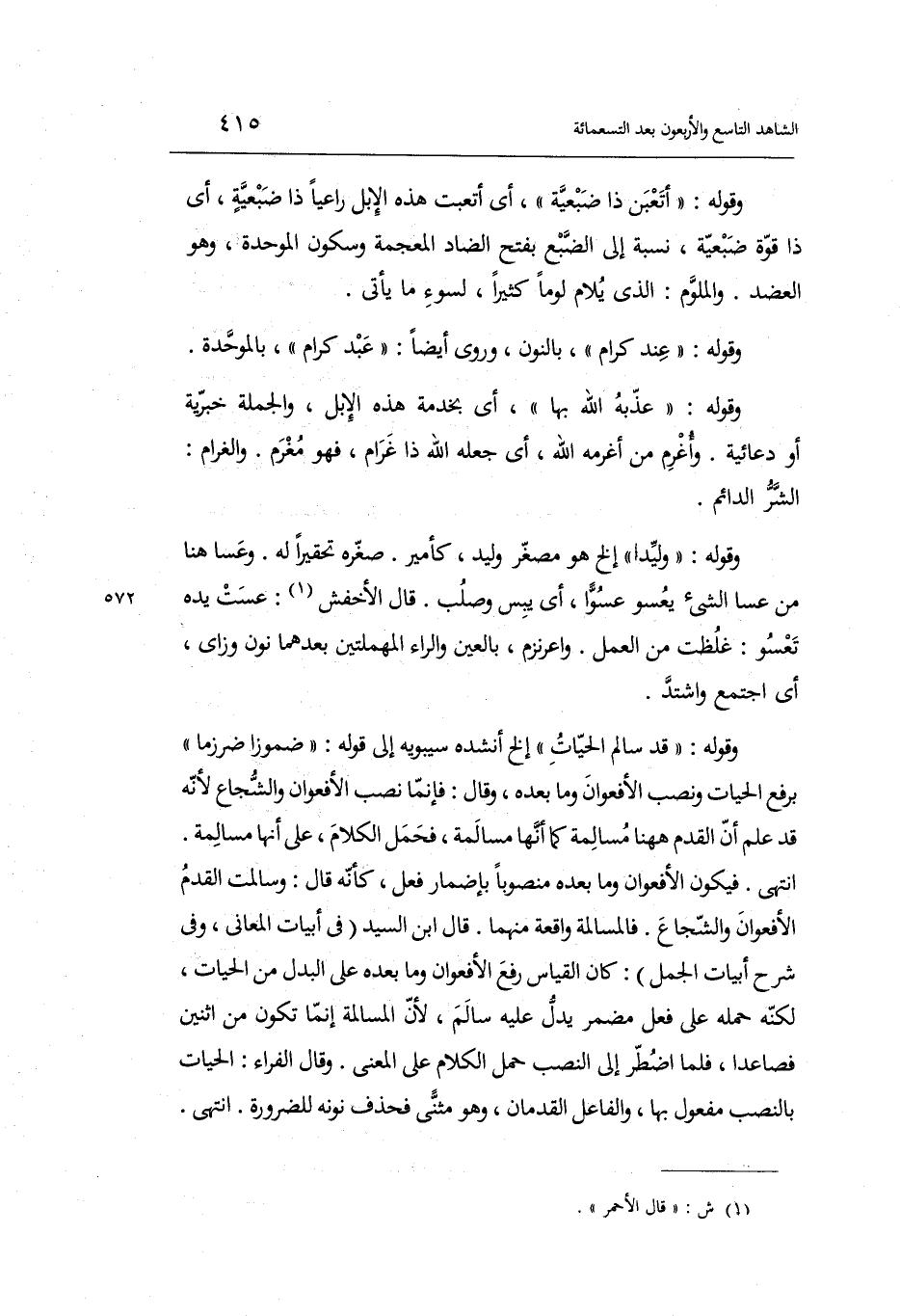 وَقَوله: قد سَالم الْحَيَّات ... إِلَخ أنْشدهُ سِيبَوَيْهٍ إِلَى قَوْله: ضموزاً ضرزماً بِرَفْع الْحَيَّات وَنصب الأفعوان وَمَا بعده وَقَالَ: فَإِنَّمَا نصب الأفعوان والشجاع لِأَنَّهُ قد علم أَن الْقدَم هَا هُنَا مسالمة كَمَا أَنَّهَا مسالمة فَحمل الْكَلَام على أَنَّهَا مسالمة. انْتهى.