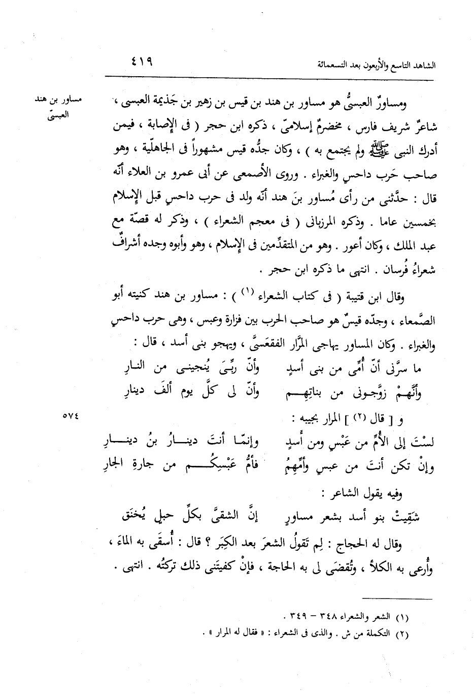 وَقَالَ ابْن قُتَيْبَة فِي كتاب الشُّعَرَاء: مساور بن هِنْد كنيته أَبُو الصمعاء وجده قيس هُوَ صَاحب الْحَرْب بَين فَزَارَة وَعَبس وَهِي حَرْب داحس والغبراء. وَكَانَ الْمسَاوِر يهاجي المرار الفقعسي)