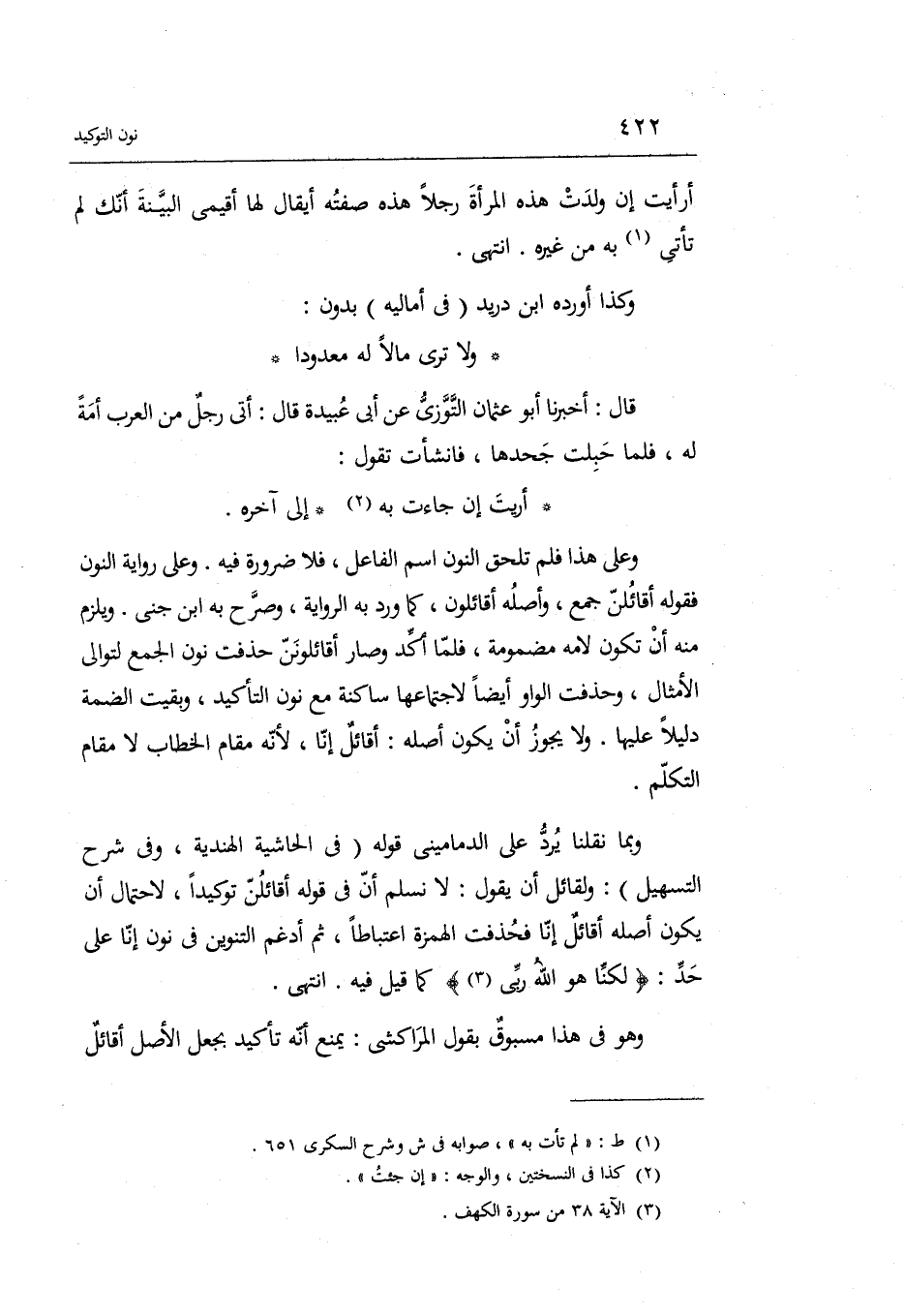 وَبِمَا نقلنا يرد على الدماميني قَوْله فِي الْحَاشِيَة الْهِنْدِيَّة وَفِي شرح التسهيل: وَلقَائِل أَن يَقُول: لانسلم أَن فِي قَوْله أقائلن توكيداً لاحْتِمَال أَن يكون أَصله أقائل إِنَّا فحذفت الْهمزَة اعتباطاً ثمَّ أدغم التَّنْوِين فِي نون إِنَّا على حد: لَكنا هُوَ الله رَبِّي كَمَا قيل فِيهِ. انْتهى.
