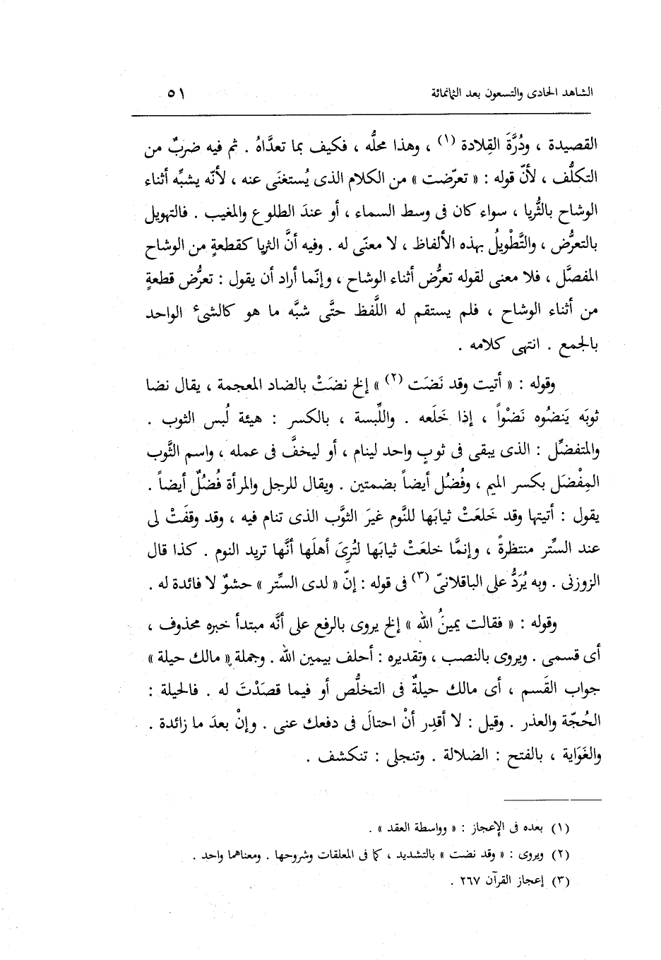 القصيدة ودرة القلادة وَهَذَا مَحَله فَكيف بِمَا تعداه ثمَّ فِيهِ ضرب من التَّكَلُّف لِأَن قَوْله: تعرضت من الْكَلَام الَّذِي يسْتَغْنى عَنهُ لِأَنَّهُ يشبه أثْنَاء الوشاح بِالثُّرَيَّا سَوَاء كَانَ فِي وسط السَّمَاء أَو عِنْد الطُّلُوع والمغيب فالتهويل بالتعرض والتطويل بِهَذِهِ الْأَلْفَاظ لَا معنى لَهُ.