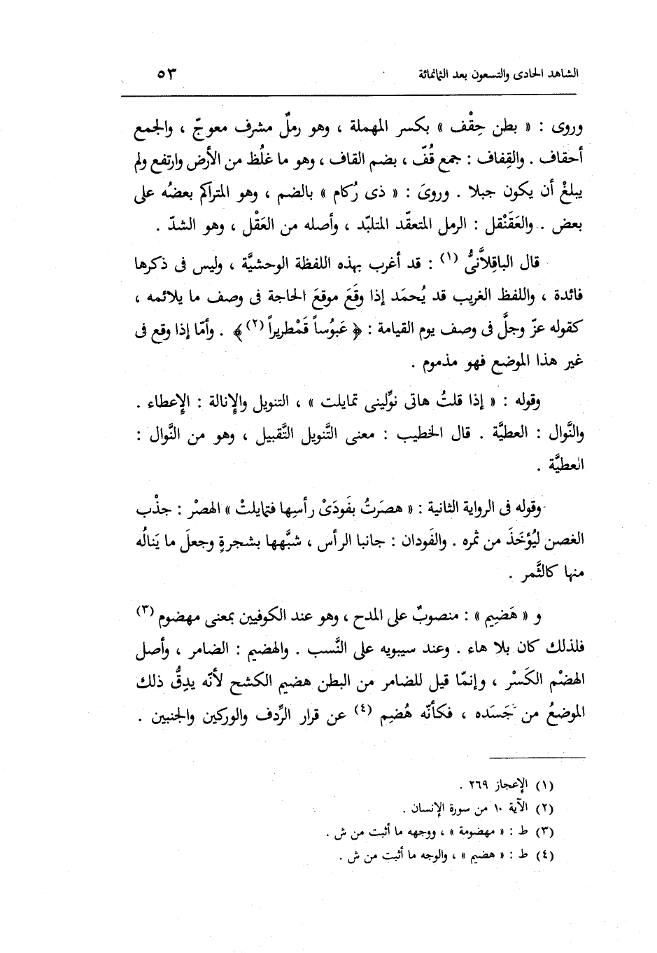 قَالَ الباقلاني: قد أغرب بِهَذِهِ اللَّفْظَة الوحشية وَلَيْسَ فِي ذكرهَا فَائِدَة وَاللَّفْظ الْغَرِيب قد يحمد إِذا وَقع موقع الْحَاجة فِي وصف مَا يلائمه كَقَوْلِه عَزَّ وَجَلَّ فِي وصف يَوْم الْقِيَامَة:)