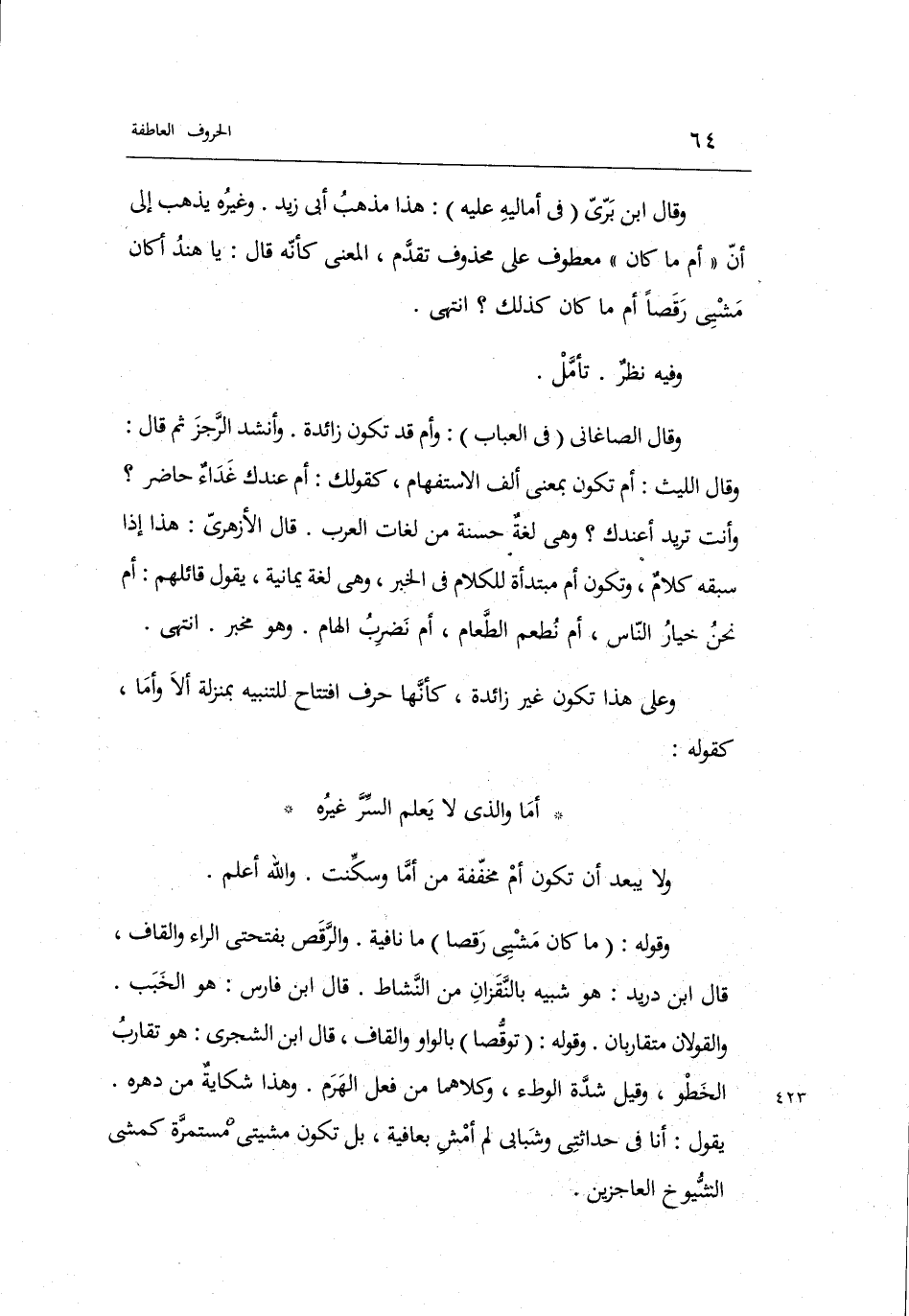 وَقَالَ ابْن بري فِي أَمَالِيهِ عَلَيْهِ: هَذَا مَذْهَب أبي زيد. وَغَيره يذهب إِلَى أَن أم مَا كَانَ مَعْطُوف على مَحْذُوف تقدم الْمَعْنى كَأَنَّهُ قَالَ: يَا هِنْد أَكَانَ مشيي رقصاً أم مَا كَانَ كَذَلِك انْتهى.
