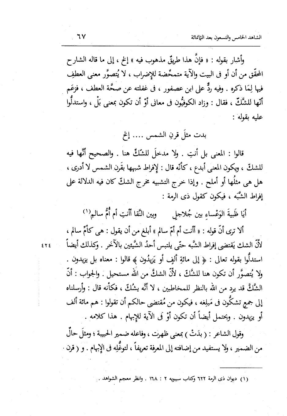 أَلا ترى أَن قَوْله: أَأَنْت أم أم سَالم أبلغ من أَن يَقُول: هِيَ كَأُمّ سَالم لِأَن الشَّك يَقْتَضِي إفراط الشّبَه حَتَّى يلتبس أحد الشَّيْئَيْنِ بِالْآخرِ. وَكَذَلِكَ أَيْضا استدلوا بقوله تَعَالَى: إِلَى مائَة ألفٍ أَو يزِيدُونَ قَالُوا: مَعْنَاهُ بل يزِيدُونَ.