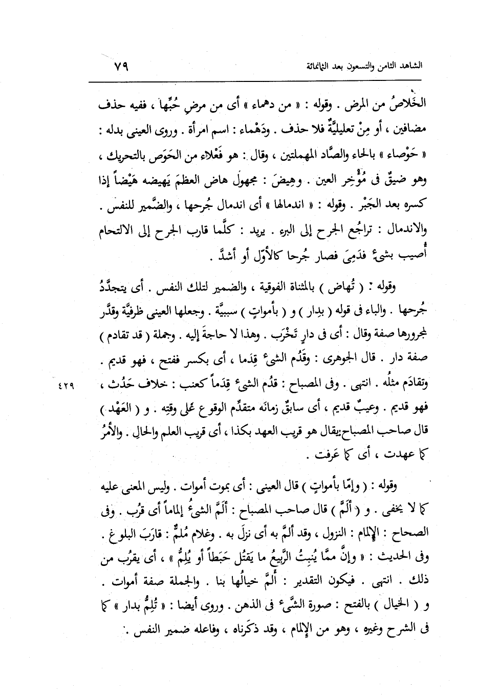 وَقَوله: تهاض بِالْمُثَنَّاةِ الْفَوْقِيَّة وَالضَّمِير لتِلْك النَّفس أَي: يَتَجَدَّد جرحها. وَالْبَاء فِي قَوْله بدار وأموات سَبَبِيَّة. وَجعلهَا الْعَيْنِيّ ظرفية وَقدر لمجرورها صفة وَقَالَ: أَي: فِي دارٍ تخرب. وَهَذَا لَا حَاجَة إِلَيْهِ وَجُمْلَة قد تقادم: صفة دَار.