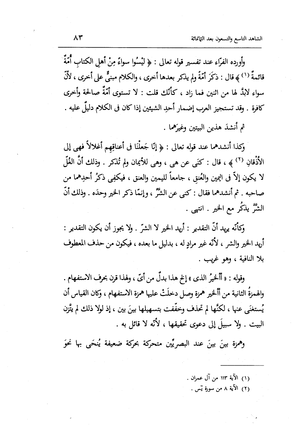 وَأوردهُ الْفراء عِنْد تَفْسِير قَوْله تَعَالَى: لَيْسُوا سَوَاء من أهل الْكتاب أمةٌ قائمةٌ قَالَ: ذكر أمة وَلم يذكر بعْدهَا أُخْرَى وَالْكَلَام مَبْنِيّ على أُخْرَى لِأَن سَوَاء لابد لَهَا من اثْنَيْنِ فَمَا زَاد كَأَنَّك قلت: لَا تستوي أمة صَالِحَة وَأُخْرَى كَافِرَة وَقد تستجيز الْعَرَب إِضْمَار أحد الشَّيْئَيْنِ إِذا كَانَ فِي الْكَلَام دَلِيل عَلَيْهِ.