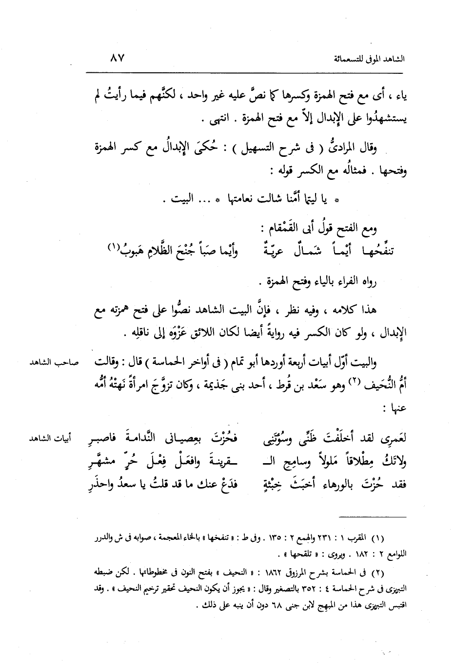 وَالْبَيْت أول أَبْيَات أَرْبَعَة أوردهَا أَبُو تَمام فِي أَوَاخِر الحماسة قَالَ: وَقَالَت أم النحيف وَهُوَ سعد)