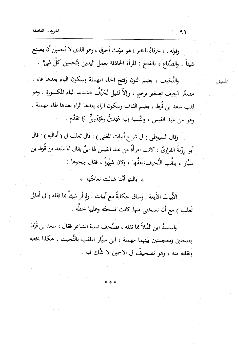 وَقَالَ السُّيُوطِيّ فِي شرح أَبْيَات الْمُغنِي: قَالَ ثَعْلَب فِي أَمَالِيهِ: قَالَ أَبُو رزمة الْفَزارِيّ: كَانَت امْرَأَة من عبد الْقَيْس لَهَا ابنٌ يُقَال لَهُ: سعد بن قرط بن سيار يلقب النحيف يعقها وَكَانَ شريراً فَقَالَ: يهجوها: