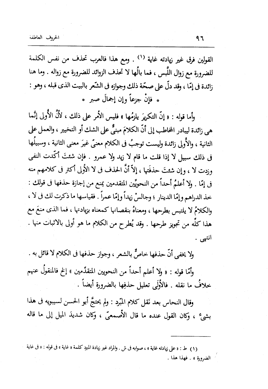 فَإِن شِئْت أكدت النَّفْي وزدت لَا وَإِن شِئْت حذفتها إِلَّا أَن الْحَذف فِي لَا الأولى أَكثر فِي وَلَا اعْلَم أحدا من النَّحْوِيين الْمُتَقَدِّمين يمْنَع من إجَازَة حذفهَا فِي قَوْلك: خُذ الدَّرَاهِم وَإِمَّا الدِّينَار وجالس زيدا وَإِمَّا عمرا فقياسها مَا ذكرت لَك فِي لَا وَالْكَلَام لَا يلتبس بطرحها وَمَعْنَاهُ بنقصانها كمعناه بزيادتها فَمَا الَّذِي منع مَعَ هَذَا كُله من تَجْوِيز طرحها وَقد يطْرَح من الْكَلَام مَا هُوَ أولى بالإثبات مِنْهَا. انْتهى.
