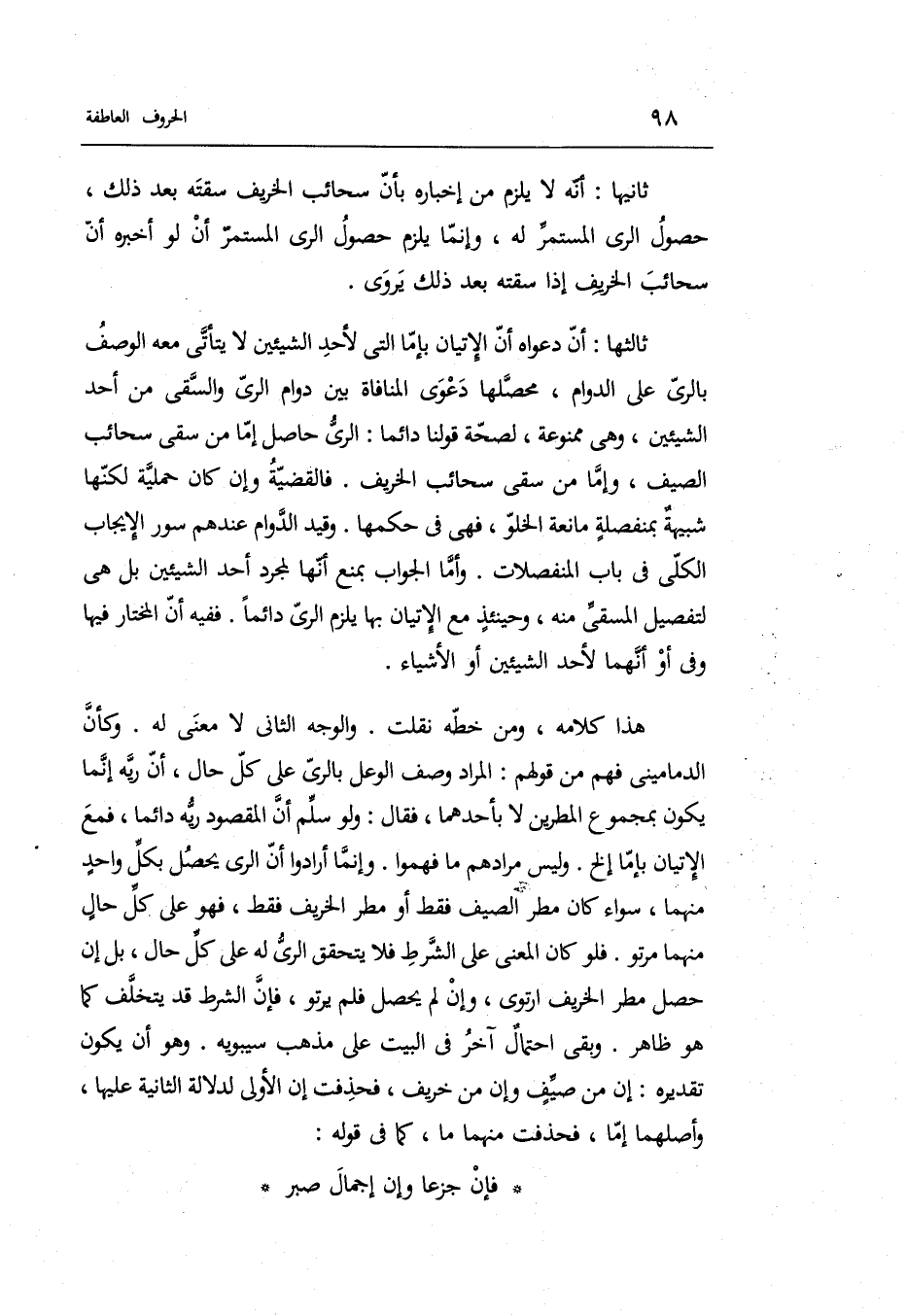 ثَالِثهَا: أَن دَعْوَاهُ أَن ألإتيان بإما الَّتِي لأحد الشَّيْئَيْنِ لَا يأتى مَعَه الْوَصْف بِالريِّ على الدَّوَام محصلها دَعْوَى الْمُنَافَاة بَين دوَام الرّيّ والسقي من اُحْدُ الشَّيْئَيْنِ وَهِي مَمْنُوعَة لصِحَّة قَوْلنَا دَائِما: الرّيّ حَاصِل إِمَّا من سقِِي سحائب الصَّيف وَإِمَّا من سقِِي سحائب الخريف.