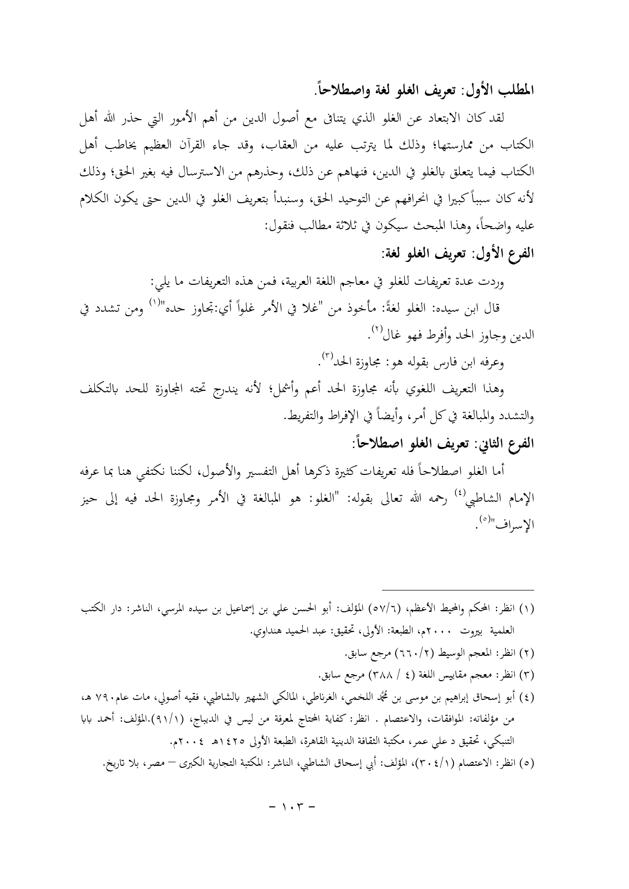 أما الغلو اصطلاحاً فله تعريفات كثيرة ذكرها أهل التفسير والأصول, لكننا نكتفي هنا بما عرفه الإمام الشاطبي (¬4) رحمه الله تعالى بقوله: "الغلو: هو المبالغة في الأمر ومجاوزة الحد فيه إلى حيز الإسراف" (¬5).