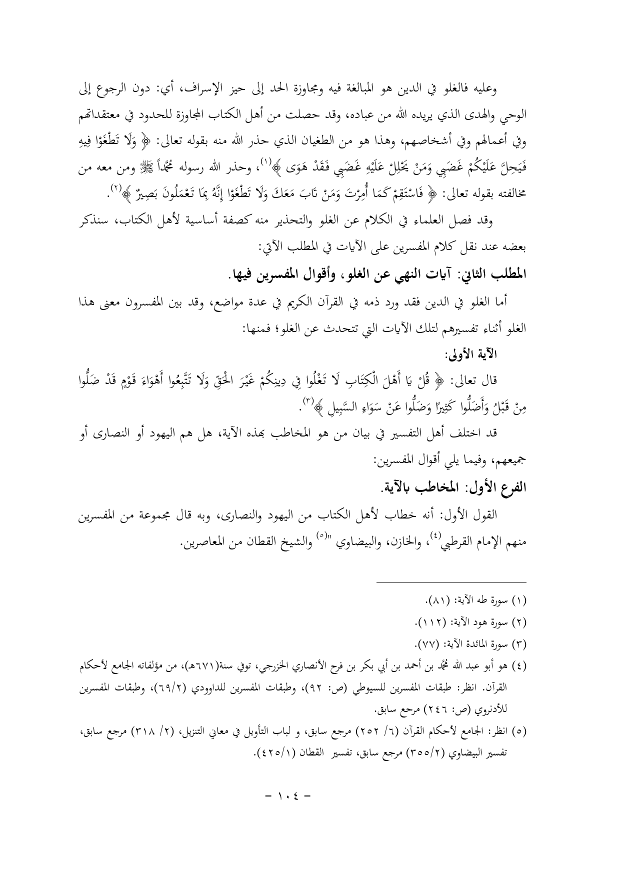 المطلب الثاني: آيات النهي عن الغلو, وأقوال المفسرين فيها.