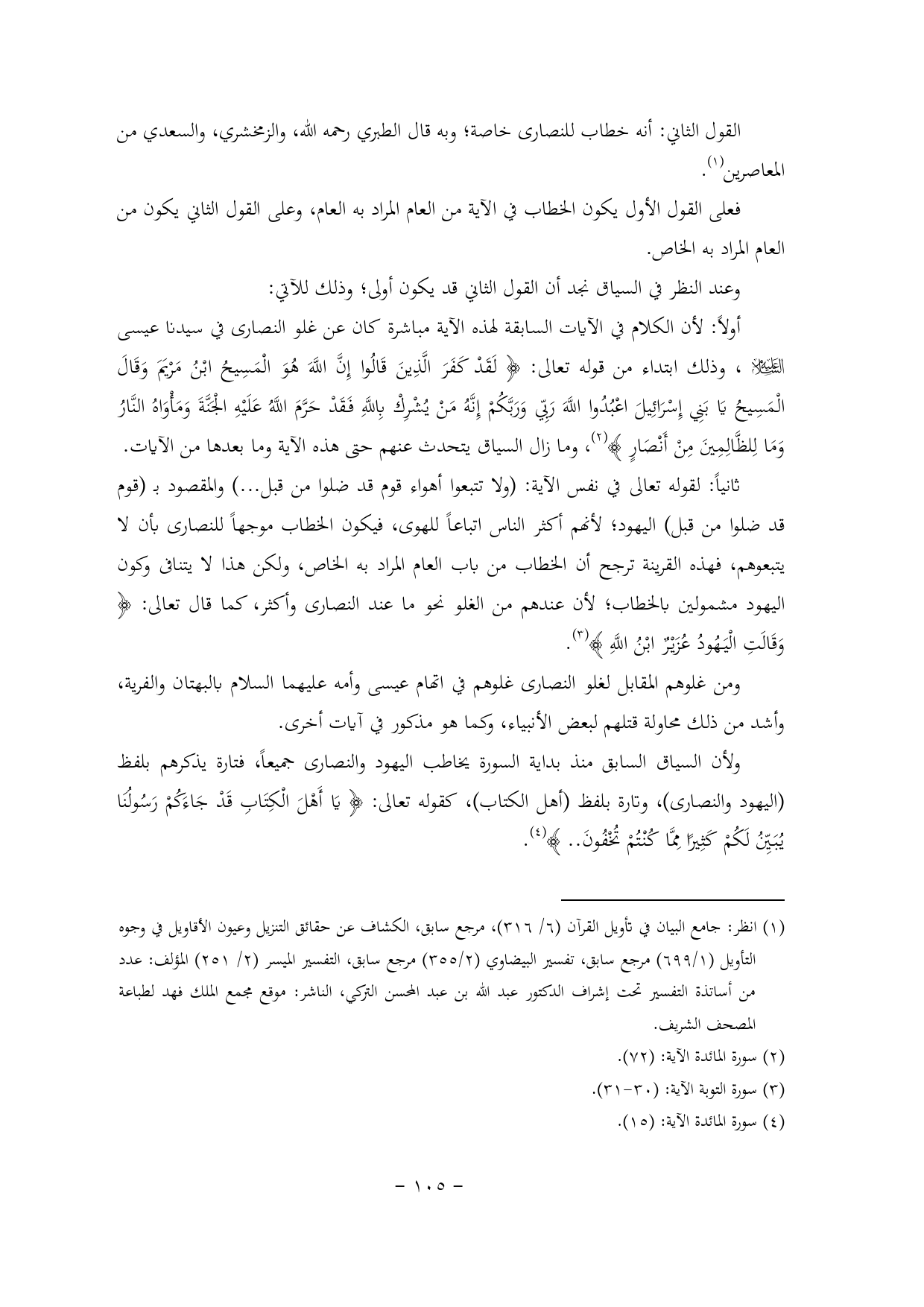 ثانياً: لقوله تعالى في نفس الآية: (ولا تتبعوا أهواء قوم قد ضلوا من قبل ... ) والمقصود بـ (قوم قد ضلوا من قبل) اليهود؛ لأنهم أكثر الناس اتباعاً للهوى, فيكون الخطاب موجهاً للنصارى بأن لا يتبعوهم, فهذه القرينة ترجح أن الخطاب من باب العام المراد به الخاص, ولكن هذا لا يتنافى وكون اليهود مشمولين بالخطاب؛ لأن عندهم من الغلو نحو ما عند النصارى وأكثر, كما قال تعالى: {وَقَالَتِ الْيَهُودُ عُزَيْرٌ ابْنُ اللَّهِ} (¬3).