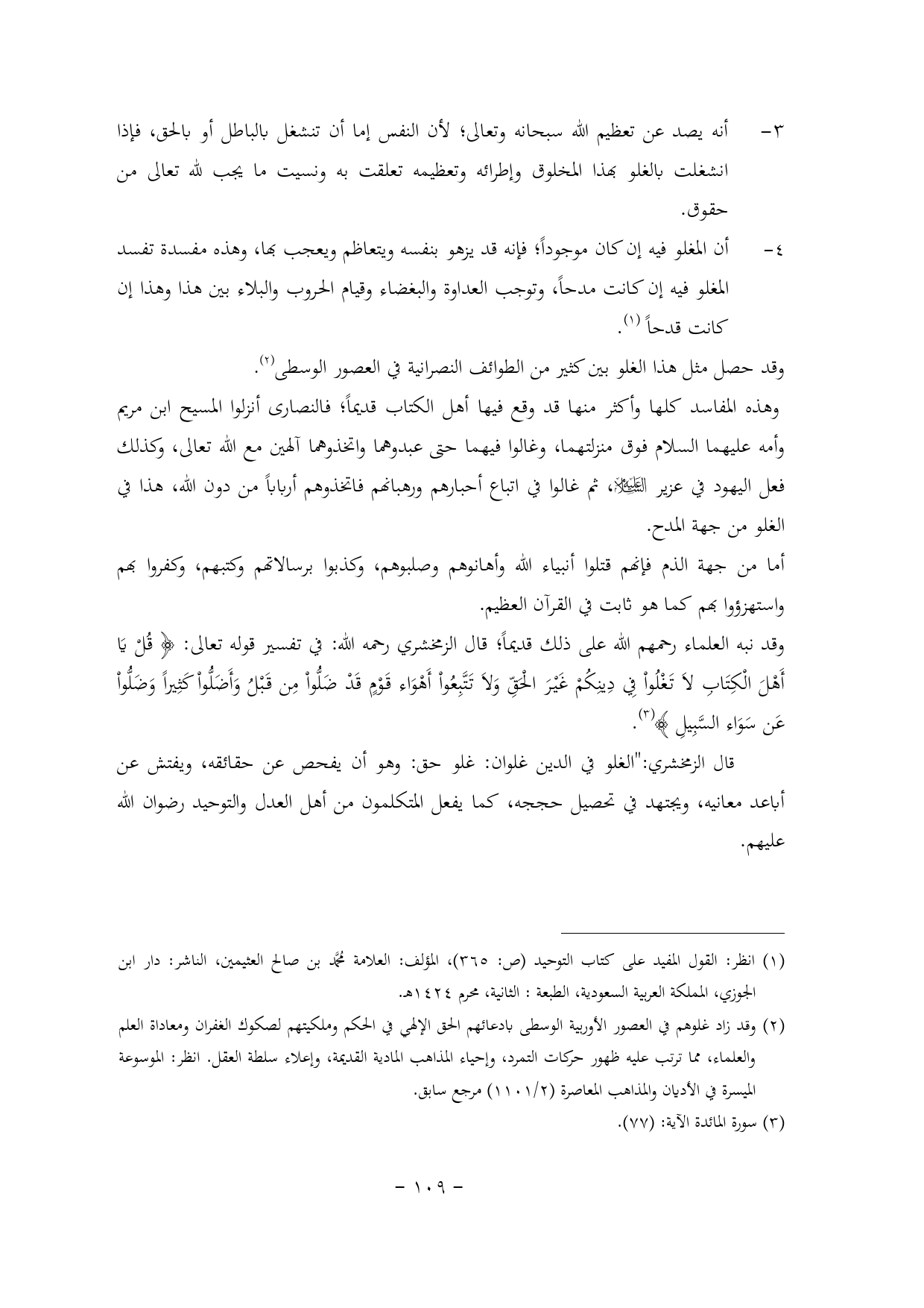 وهذه المفاسد كلها وأكثر منها قد وقع فيها أهل الكتاب قديماً؛ فالنصارى أنزلوا المسيح ابن مريم وأمه عليهما السلام فوق منزلتهما, وغالوا فيهما حتى عبدوهما واتخذوهما آلهين مع الله تعالى, وكذلك فعل اليهود في عزير - عليه السلام - , ثم غالوا في اتباع أحبارهم ورهبانهم فاتخذوهم أرباباً من دون الله, هذا في الغلو من جهة المدح.