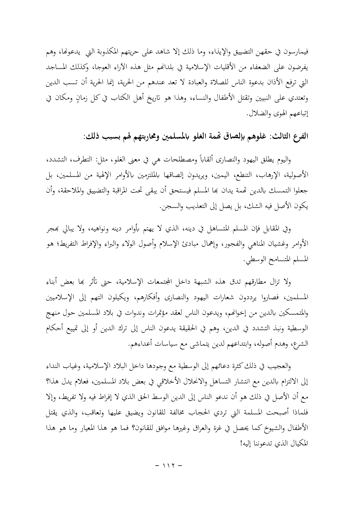 واليوم يطلق اليهود والنصارى ألقاباً ومصطلحات هي في معنى الغلو, مثل: التطرف, التشدد, الأصولية, الإرهاب, التنطع, اليمين, ويريدون إلصاقها بالملتزمين بالأوامر الإلهية من المسلمين, بل جعلوا التمسك بالدين تهمة يدان بها المسلم فيستحق أن يبقى تحت المراقبة والتضييق والملاحقة, وأن يكون الأصل فيه الشك, بل يصل إلى التعذيب والسجن.