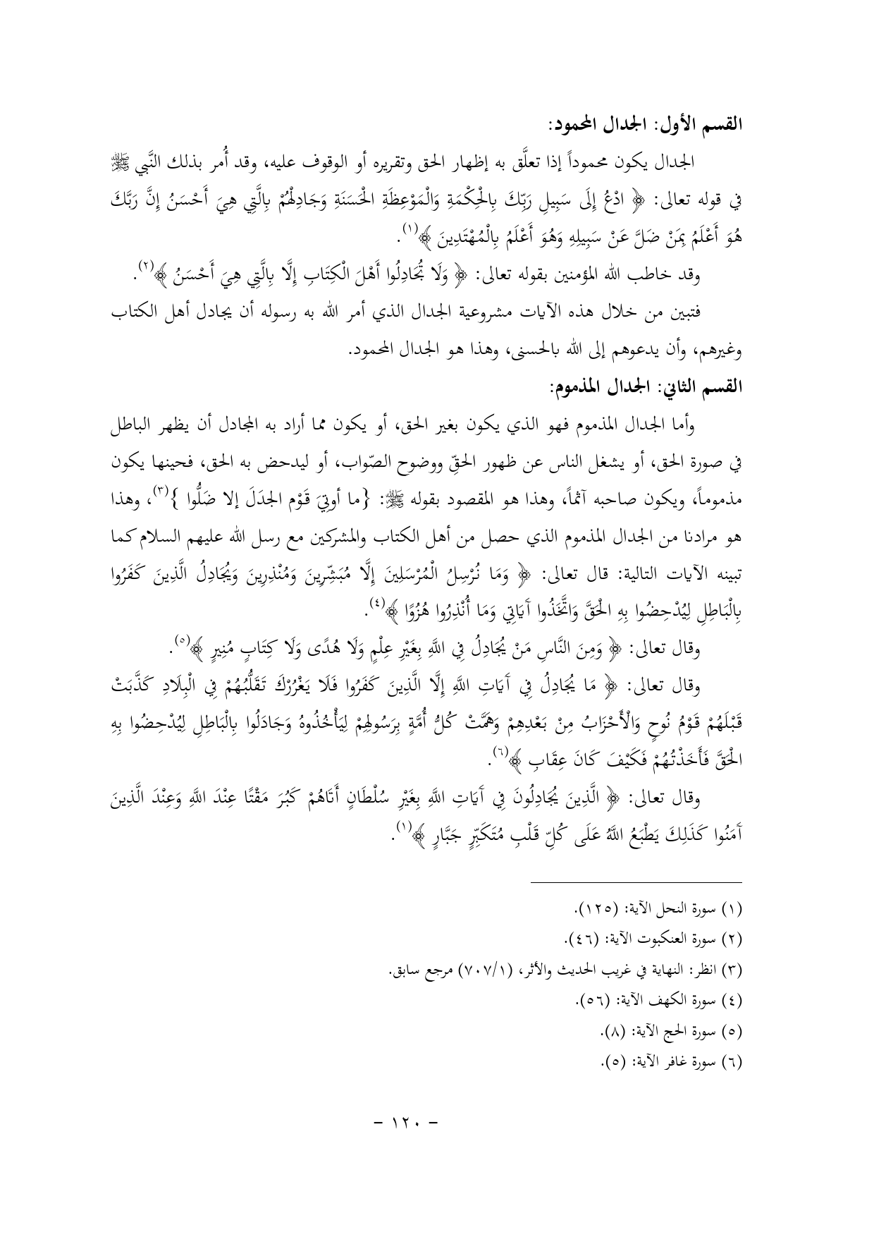 وأما الجدال المذموم فهو الذي يكون بغير الحق, أو يكون مما أراد به المجادل أن يظهر الباطل في صورة الحق, أو يشغل الناس عن ظهور الحقِّ ووضوح الصّواب, أو ليدحض به الحق, فحينها يكون مذموماً، ويكون صاحبه آثماً, وهذا هو المقصود بقوله - صلى الله عليه وسلم -: {ما أوتِيَ قَوْم الجدَلَ إلا ضَلُّوا} (¬3) , وهذا هو مرادنا من الجدال المذموم الذي حصل من أهل الكتاب والمشركين مع رسل الله عليهم السلام كما تبينه الآيات التالية: قال تعالى: {وَمَا نُرْسِلُ الْمُرْسَلِينَ إِلَّا مُبَشِّرِينَ وَمُنْذِرِينَ وَيُجَادِلُ الَّذِينَ كَفَرُوا بِالْبَاطِلِ لِيُدْحِضُوا بِهِ الْحَقَّ وَاتَّخَذُوا آَيَاتِي وَمَا أُنْذِرُوا هُزُوًا} (¬4).