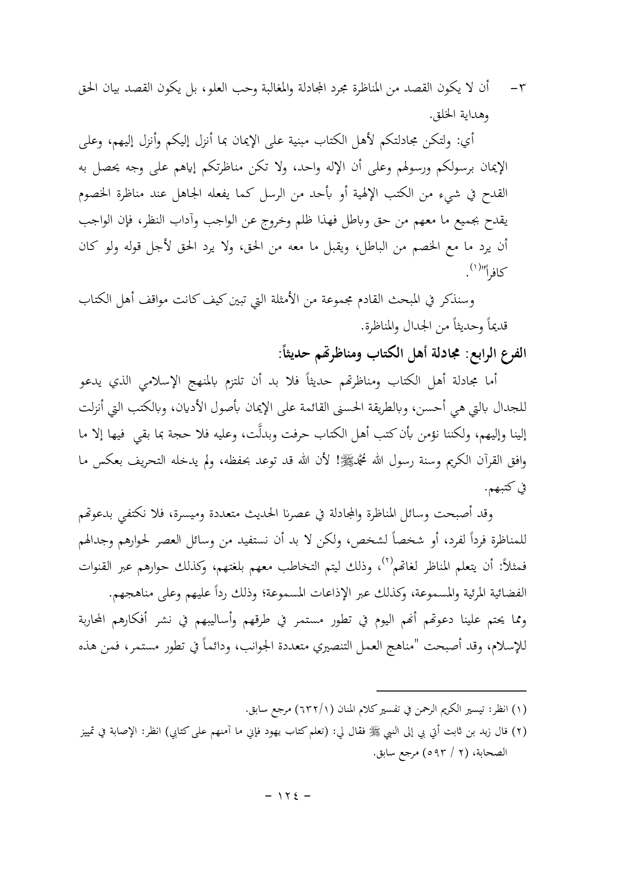 الفرع الرابع: مجادلة أهل الكتاب ومناظرتهم حديثاً: