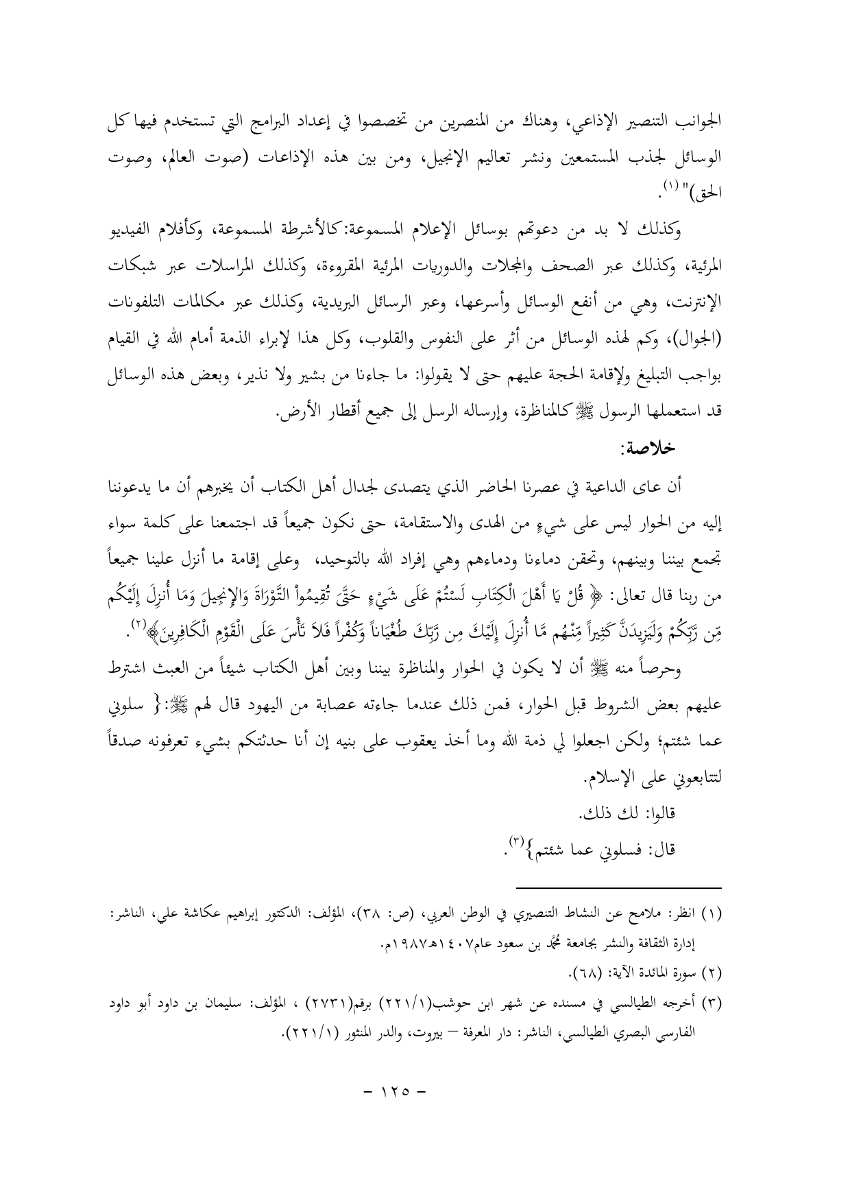 أن عاى الداعية في عصرنا الحاضر الذي يتصدى لجدال أهل الكتاب أن يخبرهم أن ما يدعوننا إليه من الحوار ليس على شيءٍ من الهدى والاستقامة, حتى نكون جميعاً قد اجتمعنا على كلمة سواء تجمع بيننا وبينهم, وتحقن دماءنا ودماءهم وهي إفراد الله بالتوحيد, وعلى إقامة ما أنزل علينا جميعاً من ربنا قال تعالى: {قُلْ يَا أَهْلَ الْكِتَابِ لَسْتُمْ عَلَى شَيْءٍ حَتَّىَ تُقِيمُوا التَّوْرَاةَ وَالإِنجِيلَ وَمَا أُنزِلَ إِلَيْكُم مِّن رَّبِّكُمْ وَلَيَزِيدَنَّ كَثِيراً مِّنْهُم مَّا أُنزِلَ إِلَيْكَ مِن رَّبِّكَ طُغْيَاناً وَكُفْراً فَلاَ تَأْسَ عَلَى الْقَوْمِ الْكَافِرِينَ} (¬2).