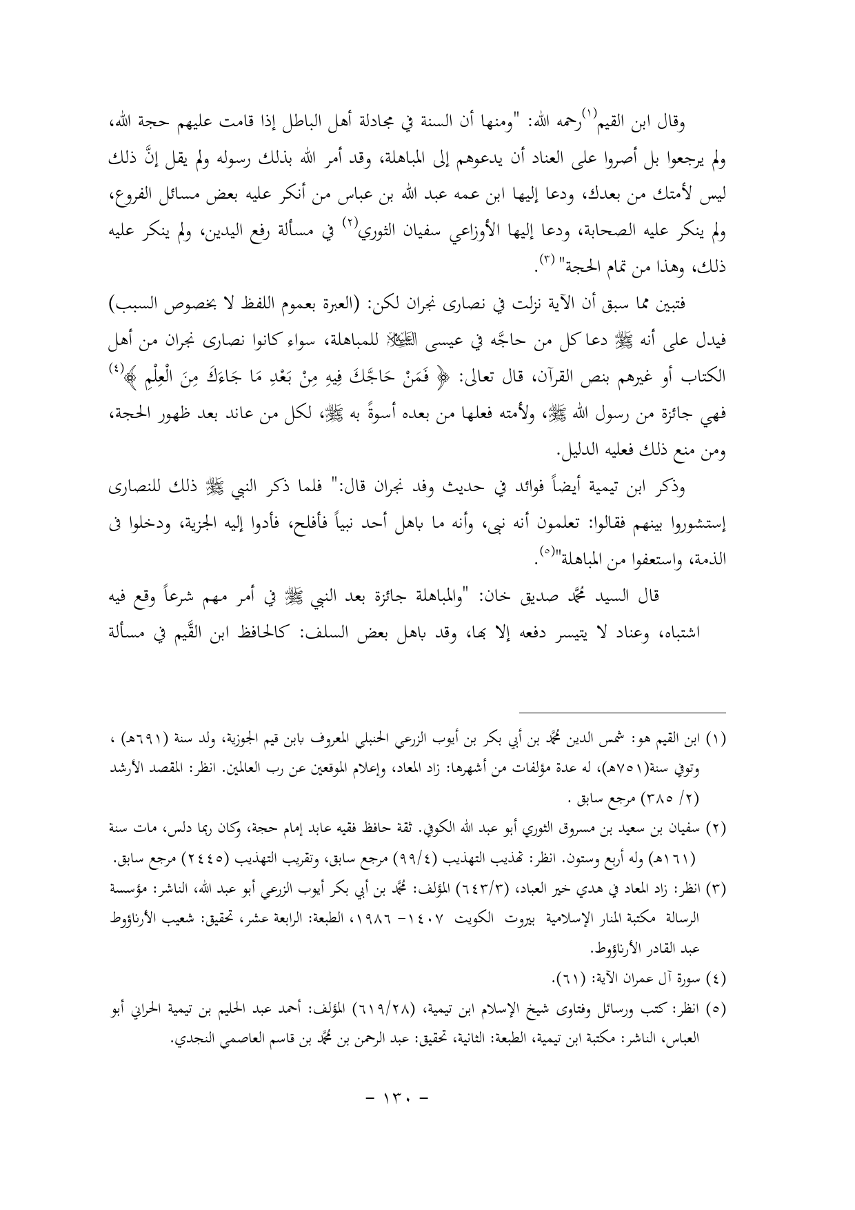 وقال ابن القيم (¬1) رحمه الله: "ومنها أن السنة في مجادلة أهل الباطل إذا قامت عليهم حجة الله, ولم يرجعوا بل أصروا على العناد أن يدعوهم إلى المباهلة, وقد أمر الله بذلك رسوله ولم يقل إنَّ ذلك ليس لأمتك من بعدك, ودعا إليها ابن عمه عبد الله بن عباس من أنكر عليه بعض مسائل الفروع, ولم ينكر عليه الصحابة, ودعا إليها الأوزاعي سفيان الثوري (¬2) في مسألة رفع اليدين, ولم ينكر عليه ذلك, وهذا من تمام الحجة" (¬3).