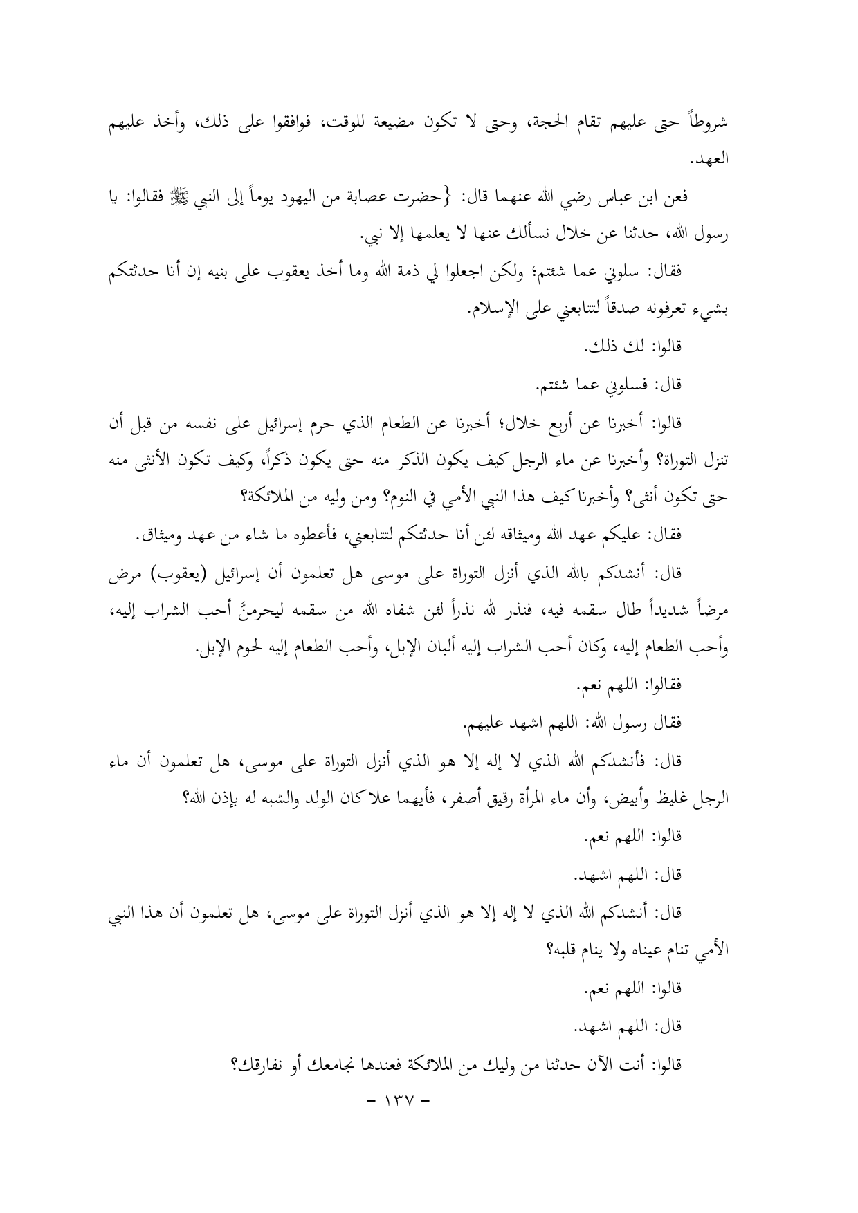 فقال: سلوني عما شئتم؛ ولكن اجعلوا لي ذمة الله وما أخذ يعقوب على بنيه إن أنا حدثتكم بشيء تعرفونه صدقاً لتتابعني على الإسلام.