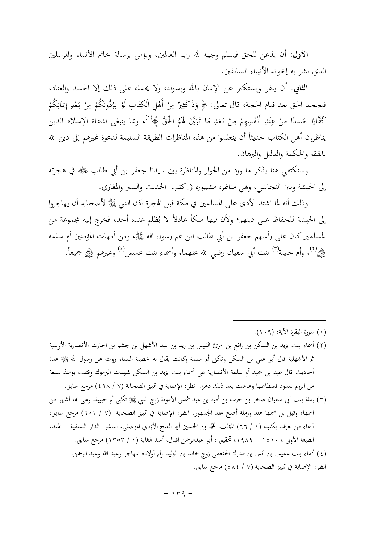 الأول: أن يذعن للحق فيسلم وجهه لله رب العالمين, ويؤمن برسالة خاتم الأنبياء والمرسلين الذي بشر به إخوانه الأنبياء السابقين.