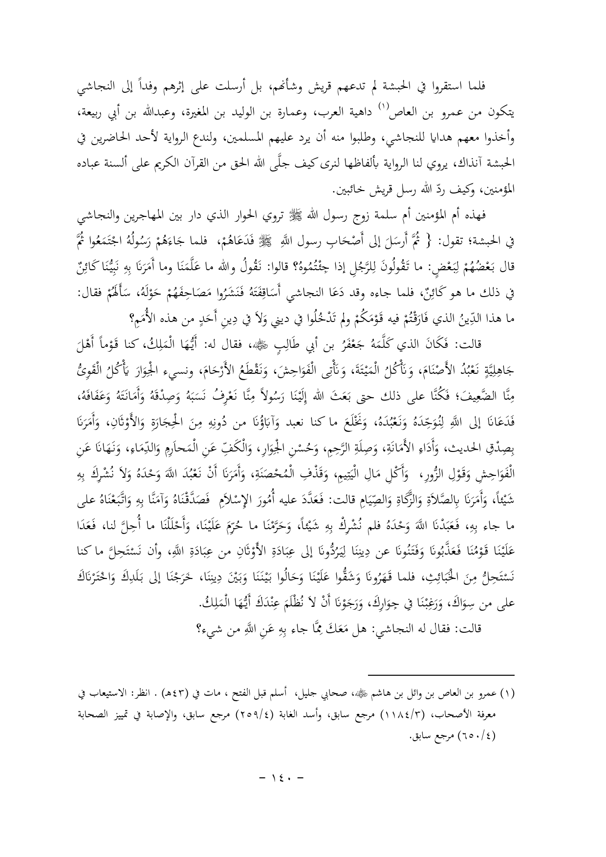 قالت: فَكَانَ الذي كَلَّمَهُ جَعْفَرُ بن أبي طَالِبٍ - رضي الله عنه - , فقال له: أَيُّهَا الْمَلِكُ, كنا قَوْماً أَهْلَ جَاهِلِيَّةٍ نَعْبُدُ الأَصْنَامَ, وَنَأْكُلُ الْمَيْتَةَ, وَنَأْتِى الْفَوَاحِشَ, وَنَقْطَعُ الأَرْحَامَ, ونسيء الْجِوَارَ يَأْكُلُ الْقَوِىُّ مِنَّا الضَّعِيفَ؛ فَكُنَّا على ذلك حتى بَعَثَ الله إِلَيْنَا رَسُولاً مِنَّا نَعْرِفُ نَسَبَهُ وَصِدْقَهُ وَأَمَانَتَهُ وَعَفَافَهُ, فَدَعَانَا إلى اللَّهِ لِنُوَحِّدَهُ وَنَعْبُدَهُ, وَنَخْلَعَ ما كنا نعبد وَآبَاؤُنَا من دُونِهِ مِنَ الْحِجَارَةِ وَالأَوْثَانِ, وَأَمَرَنَا بِصِدْقِ الحديث, وَأَدَاءِ الأَمَانَةِ, وَصِلَةِ الرَّحِمِ, وَحُسْنِ الْجِوَارِ, وَالْكَفِّ عَنِ الْمَحاَرِمِ وَالدِّمَاءِ, وَنَهَانَا عَنِ الْفَوَاحِشِ وَقَوْلِ الزُّورِ, وَأَكْلِ مَالِ الْيَتِيمِ, وَقَذْفِ الْمُحْصَنَةِ, وَأَمَرَنَا أَنْ نَعْبُدَ اللَّهَ وَحْدَهُ وَلاَ نُشْرِكَ بِهِ شَيْئاً, وَأَمَرَنَا بِالصَّلاَةِ وَالزَّكَاةِ وَالصِّيَامِ قالت: فَعَدَّدَ عليه أُمُورَ الإِسْلاَمِ فَصَدَّقْنَاهُ وَآمَنَّا بِهِ وَاتَّبَعْنَاهُ على ما جاء بِهِ, فَعَبَدْنَا اللَّهَ وَحْدَهُ فلم نُشْرِكْ بِهِ شَيْئاً, وَحَرَّمْنَا ما حُرِّمَ عَلَيْنَا, وَأَحْلَلْنَا ما أُحِلَّ لنا, فَعَدَا عَلَيْنَا قَوْمُنَا فَعَذَّبُونَا وَفَتَنُونَا عن دِينِنَا لِيَرُدُّونَا إلى عِبَادَةِ الأَوْثَانِ من عِبَادَةِ اللَّهِ, وأن نَسْتَحِلَّ ما كنا نَسْتَحِلُّ مِنَ الْخَبَائِثِ, فلما قَهَرُونَا وَشَقُّوا عَلَيْنَا وَحَالُوا بَيْنَنَا وَبَيْنَ دِينِنَا, خَرَجْنَا إلى بَلَدِكَ وَاخْتَرْنَاكَ على من سِوَاكَ, وَرَغِبْنَا في جِوَارِكَ, وَرَجَوْنَا أَنْ لاَ نُظْلَمَ عِنْدَكَ أَيُّهَا الْمَلِكُ.