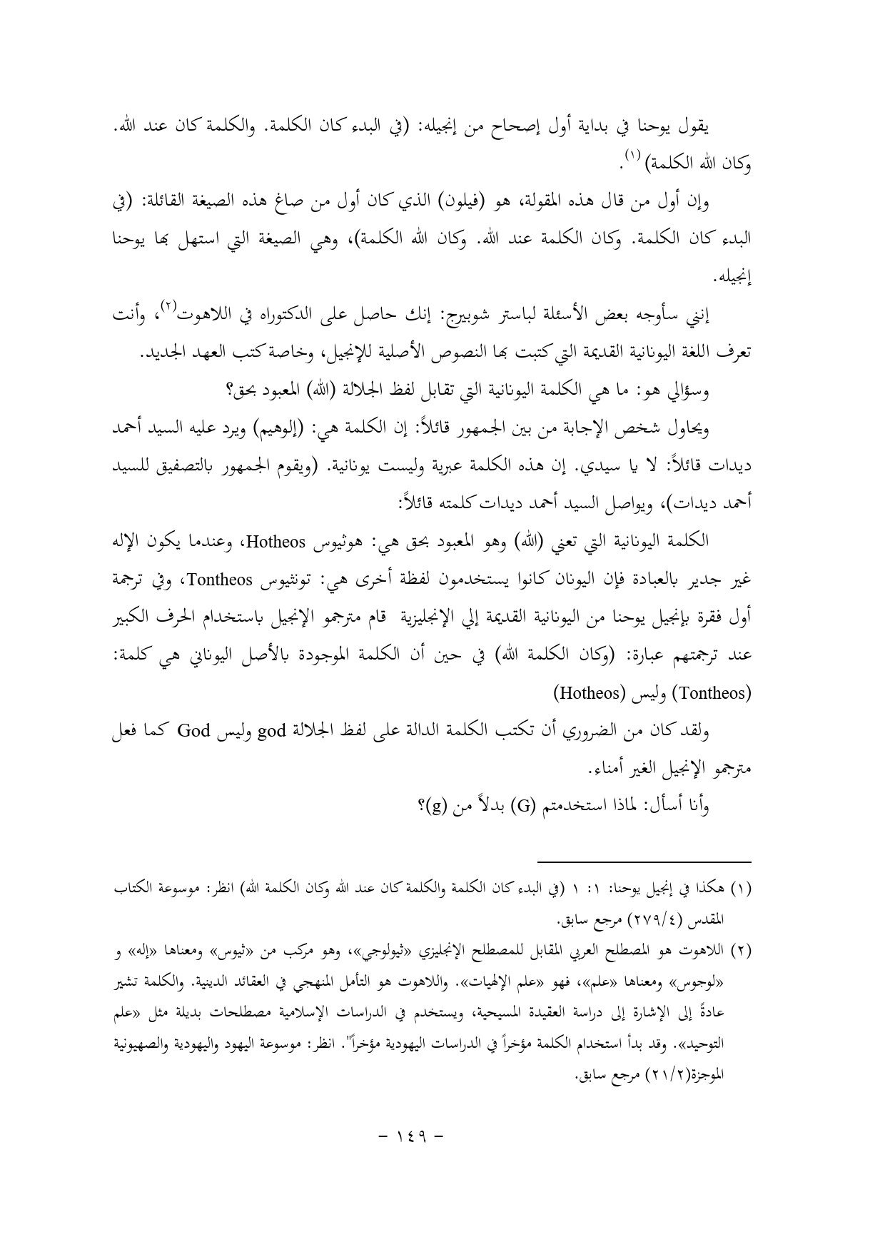 (¬1) هكذا في إنجيل يوحنا: 1: 1 (في البدء كان الكلمة والكلمة كان عند الله وكان الكلمة الله) انظر: موسوعة الكتاب المقدس (4/ 279) مرجع سابق.