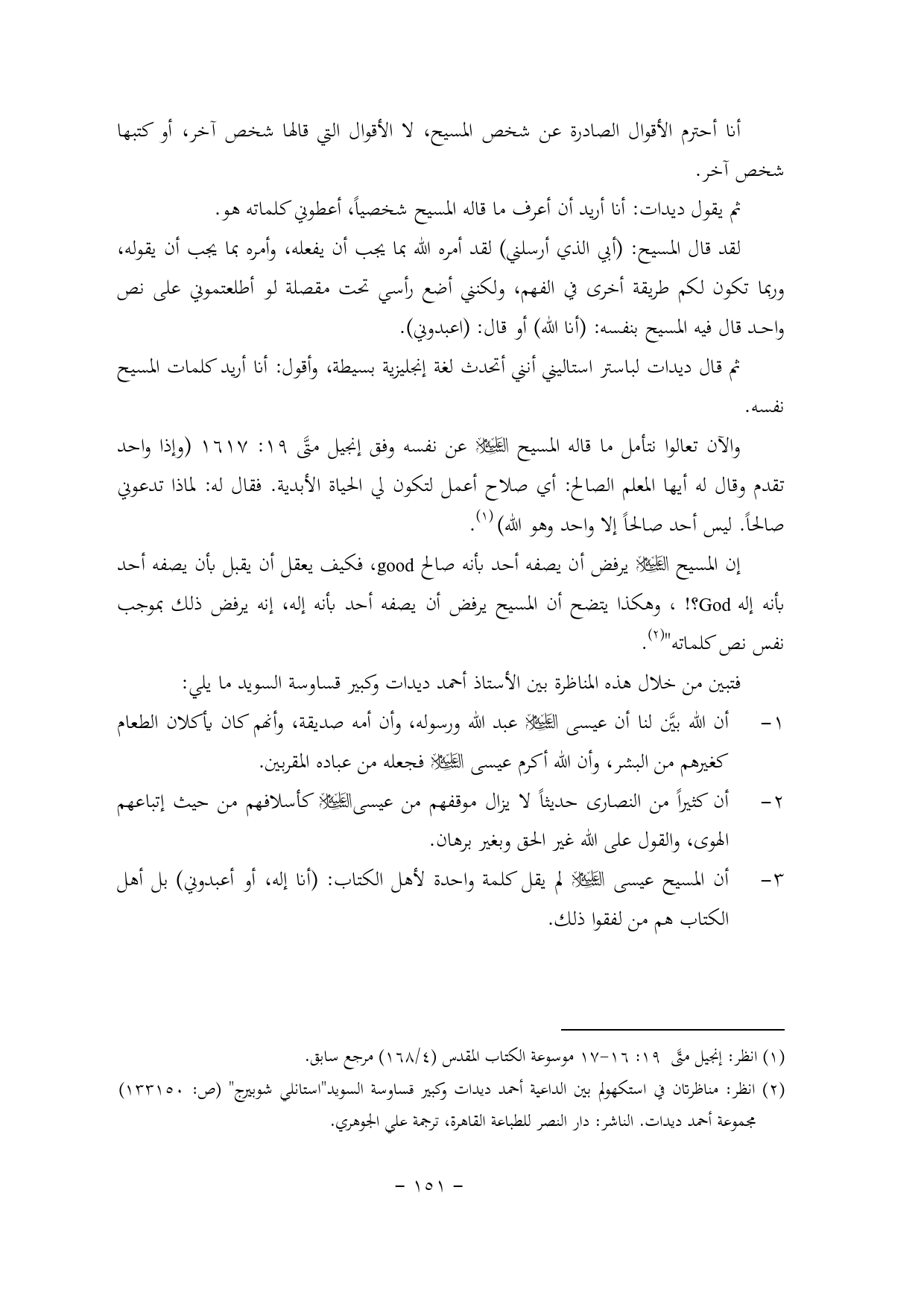 ثم يقول ديدات: أنا أريد أن أعرف ما قاله المسيح شخصياً, أعطوني كلماته هو.