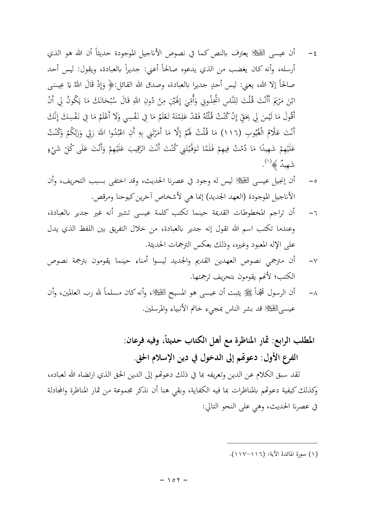 4 - أن عيسى - عليه السلام - يعترف بالنص كما في نصوص الأناجيل الموجودة حديثاً أن الله هو الذي أرسله, وأنه كان يغضب من الذي يدعوه صالحاً أعني: جديراً بالعبادة, ويقول: ليس أحد صالحاً إلا الله, يعني: ليس أحدٍ جديرا بالعبادة, وصدق الله القائل: {وَإِذْ قَالَ اللَّهُ يَا عِيسَى ابْنَ مَرْيَمَ أَأَنْتَ قُلْتَ لِلنَّاسِ اتَّخِذُونِي وَأُمِّيَ إِلَهَيْنِ مِنْ دُونِ اللَّهِ قَالَ سُبْحَانَكَ مَا يَكُونُ لِي أَنْ أَقُولَ مَا لَيْسَ لِي بِحَقٍّ إِنْ كُنْتُ قُلْتُهُ فَقَدْ عَلِمْتَهُ تَعْلَمُ مَا فِي نَفْسِي وَلَا أَعْلَمُ مَا فِي نَفْسِكَ إِنَّكَ أَنْتَ عَلَّامُ الْغُيُوبِ (116) مَا قُلْتُ لَهُمْ إِلَّا مَا أَمَرْتَنِي بِهِ أَنِ اعْبُدُوا اللَّهَ رَبِّي وَرَبَّكُمْ وَكُنْتُ عَلَيْهِمْ شَهِيدًا مَا دُمْتُ فِيهِمْ فَلَمَّا تَوَفَّيْتَنِي كُنْتَ أَنْتَ الرَّقِيبَ عَلَيْهِمْ وَأَنْتَ عَلَى كُلِّ شَيْءٍ شَهِيدٌ} (¬1).