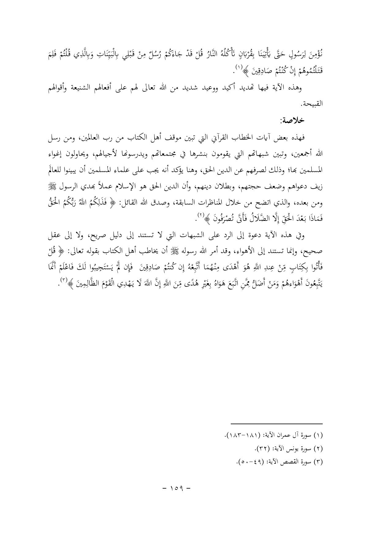 فهذه بعض آيات الخطاب القرآني التي تبين موقف أهل الكتاب من رب العالمين, ومن رسل الله أجمعين, وتبين شبهاتهم التي يقومون بنشرها في مجتمعاتهم ويدرسونها لأجيالهم, ويحاولون إغواء المسلمين بها؛ وذلك لصرفهم عن الدين الحق, وهنا يؤكد أنه يجب على علماء المسلمين أن يبينوا للعالَم زيف دعواهم وضعف حجتهم, وبطلان دينهم, وأن الدين الحق هو الإسلام عملاً بهدي الرسول - صلى الله عليه وسلم - ومن بعده, والذي اتضح من خلال المناظرات السابقة, وصدق الله القائل: {فَذَلِكُمُ اللَّهُ رَبُّكُمُ الْحَقُّ فَمَاذَا بَعْدَ الْحَقِّ إِلَّا الضَّلَالُ فَأَنَّى تُصْرَفُونَ} (¬2).