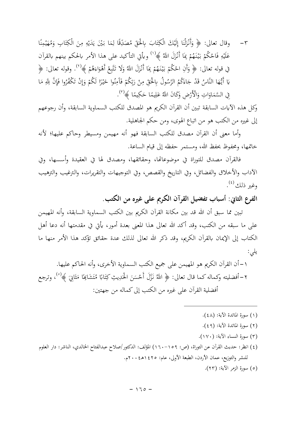 1 - أن القرآن الكريم هو المهيمن على جميع الكتب السماوية الأخرى, وأنه الحاكم عليها.
