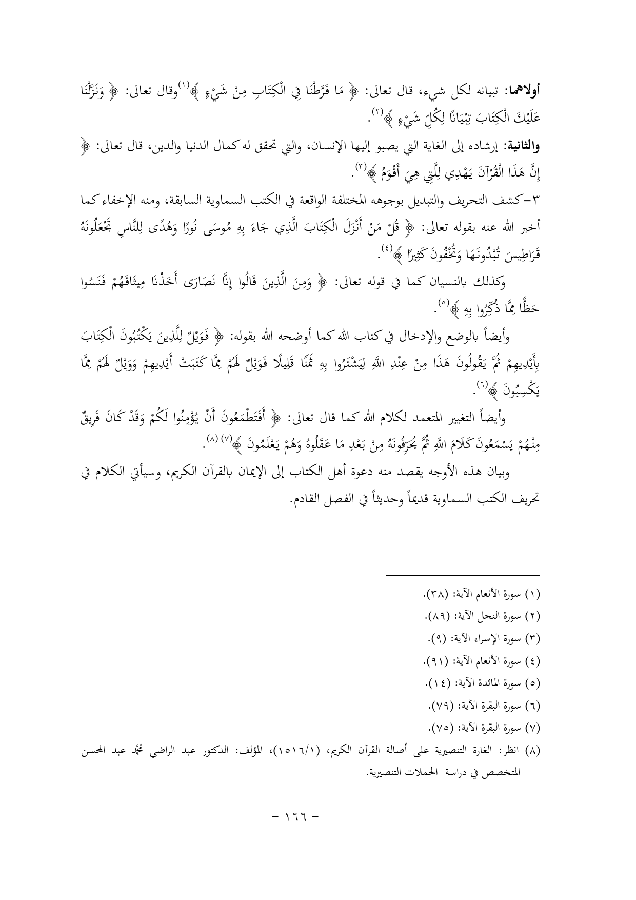وبيان هذه الأوجه يقصد منه دعوة أهل الكتاب إلى الإيمان بالقرآن الكريم, وسيأتي الكلام في تحريف الكتب السماوية قديماً وحديثاً في الفصل القادم.