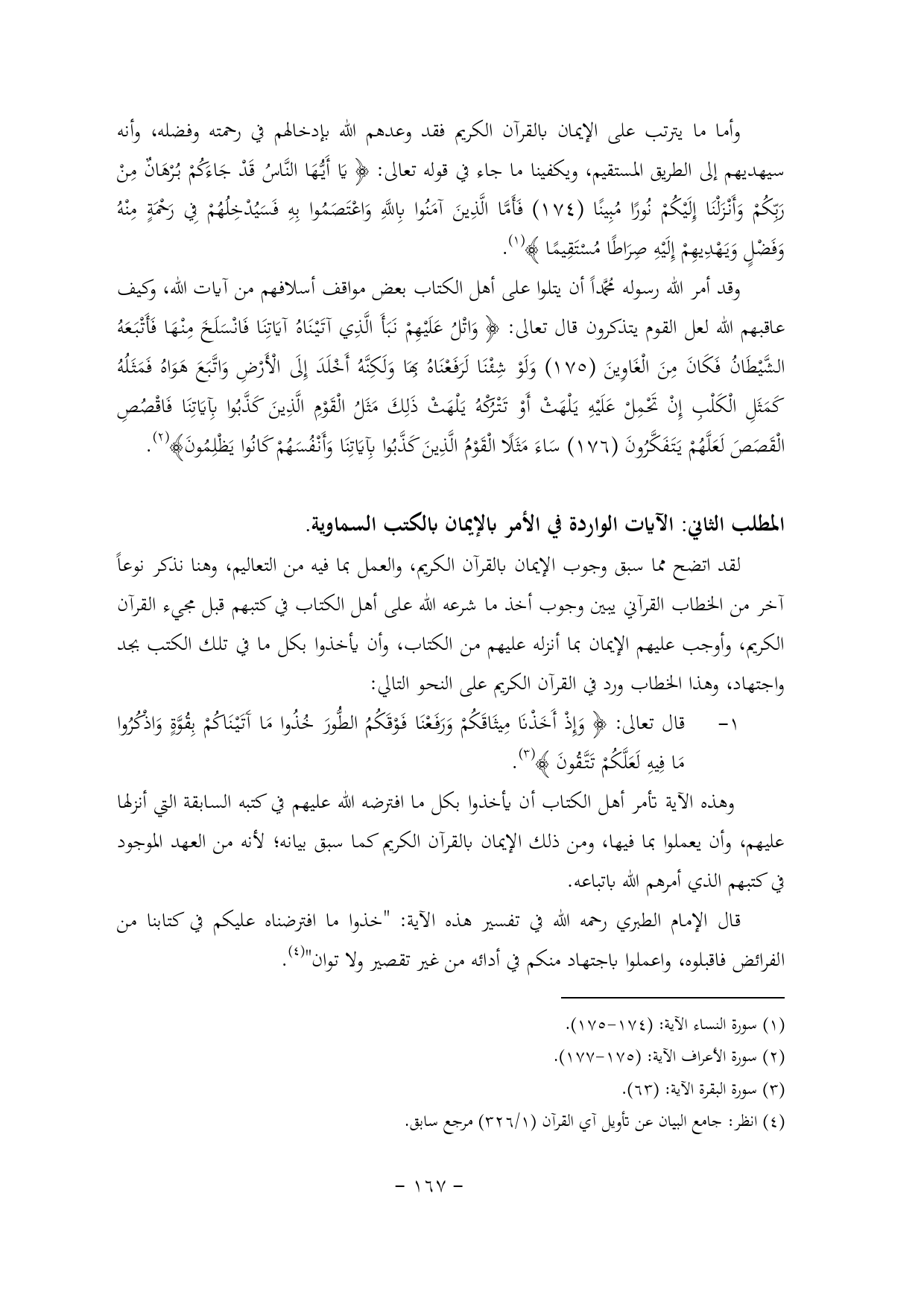 وأما ما يترتب على الإيمان بالقرآن الكريم فقد وعدهم الله بإدخالهم في رحمته وفضله, وأنه سيهديهم إلى الطريق المستقيم, ويكفينا ما جاء في قوله تعالى: {يَا أَيُّهَا النَّاسُ قَدْ جَاءَكُمْ بُرْهَانٌ مِنْ رَبِّكُمْ وَأَنْزَلْنَا إِلَيْكُمْ نُورًا مُبِينًا (174) فَأَمَّا الَّذِينَ آمَنُوا بِاللَّهِ وَاعْتَصَمُوا بِهِ فَسَيُدْخِلُهُمْ فِي رَحْمَةٍ مِنْهُ وَفَضْلٍ وَيَهْدِيهِمْ إِلَيْهِ صِرَاطًا مُسْتَقِيمًا} (¬1).